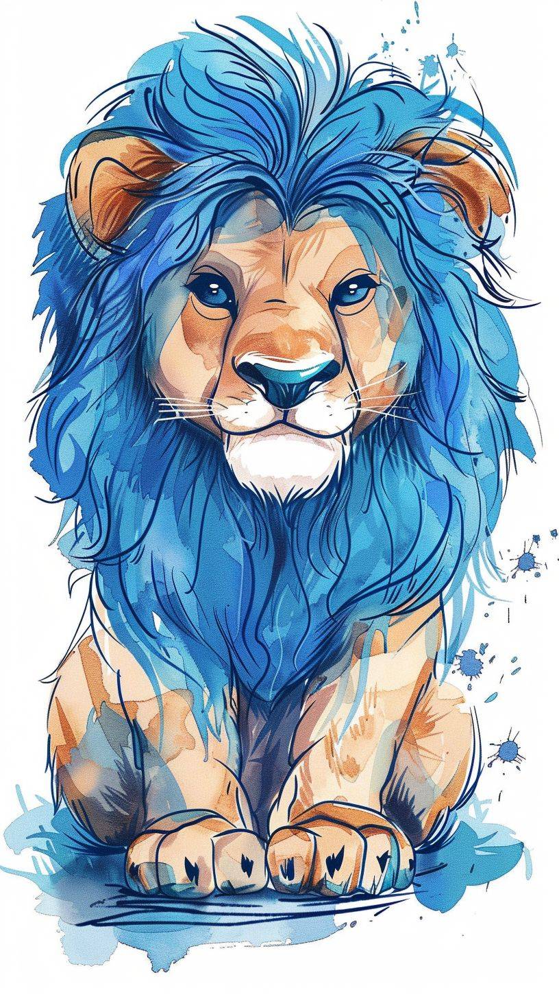 A cute lion in Ralph Steadman style, with blue hair, thick line hand-drawn style, watercolor effect, white background, rough minimalism, front view.