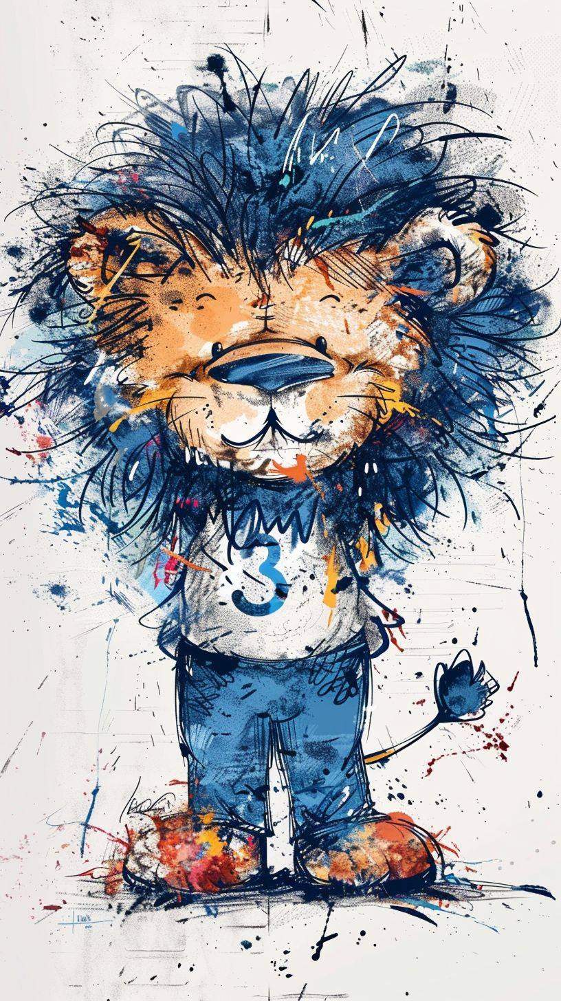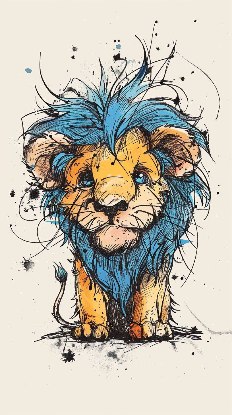 Ralph Steadman style character,A cute lion in a thick line hand-drawn style, blue hair, plush feeling, vector file, watercolor, white background, rough, minimalism, front view --ar 9:16