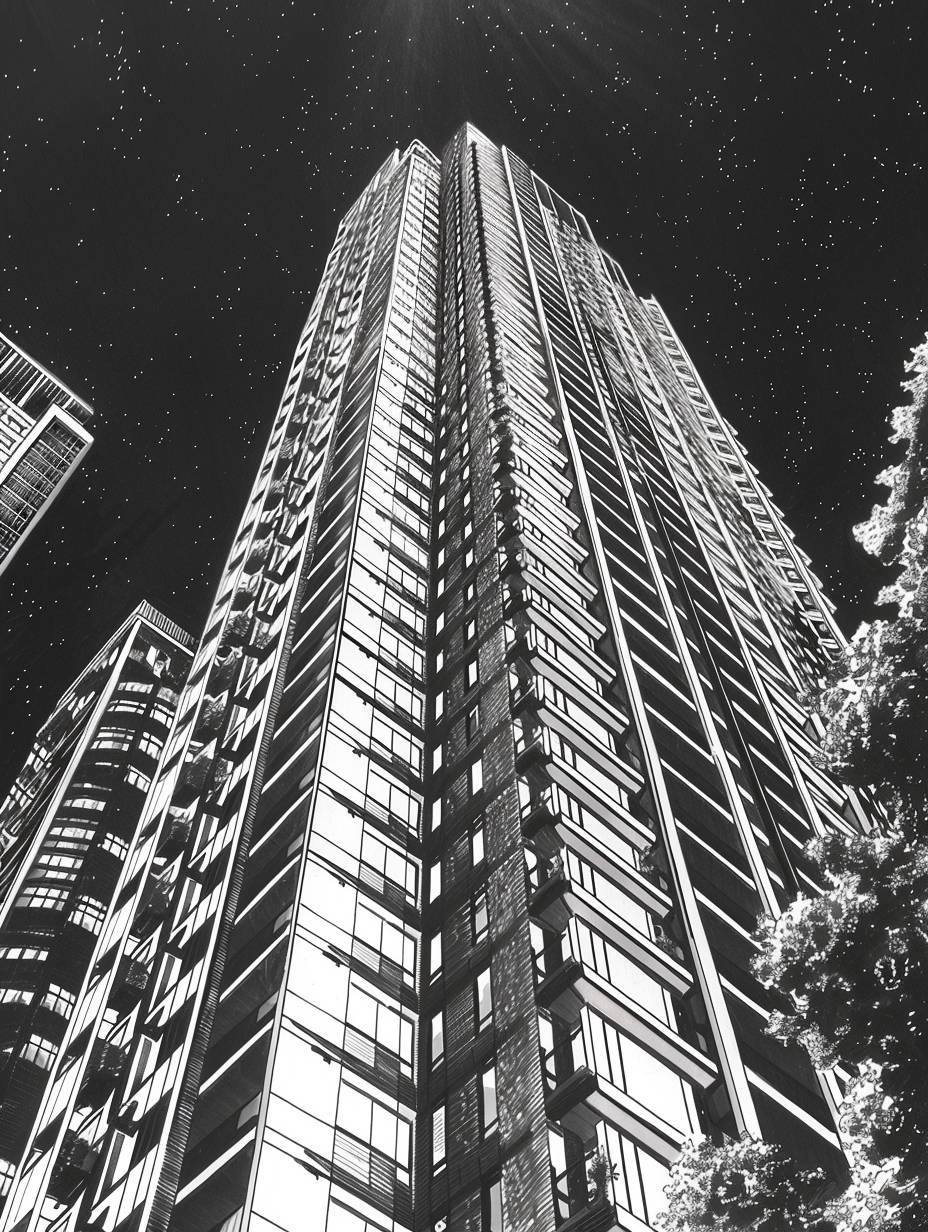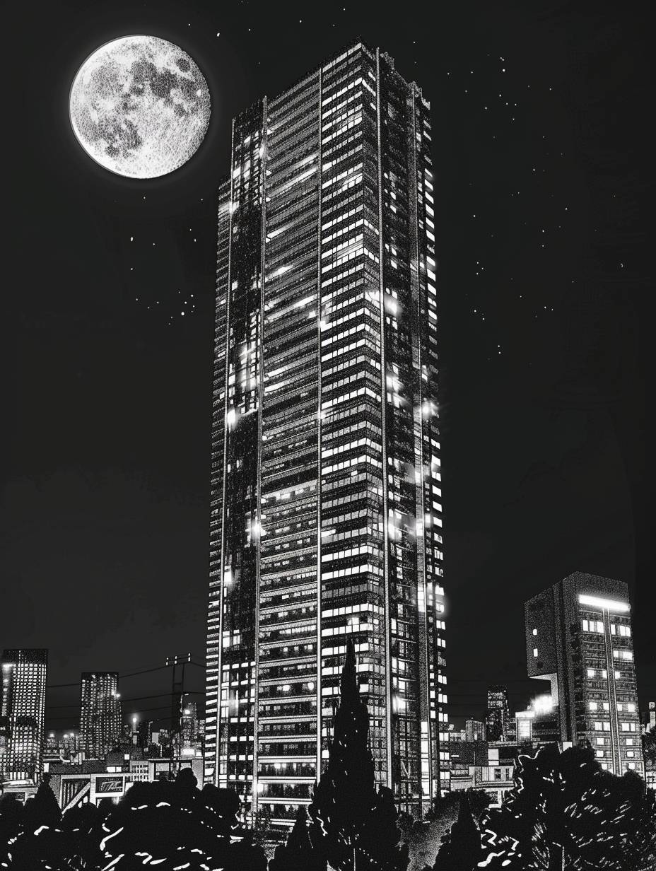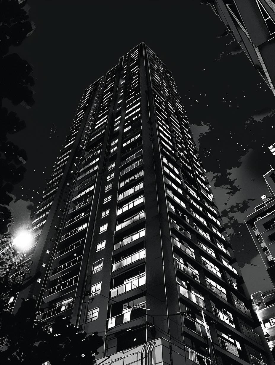 Wide shot of a tall condo in the skyline. The highest floor has a special deluxe design exterior layout. The setting is midnight. Monochrome manga art style with G-pen texture.