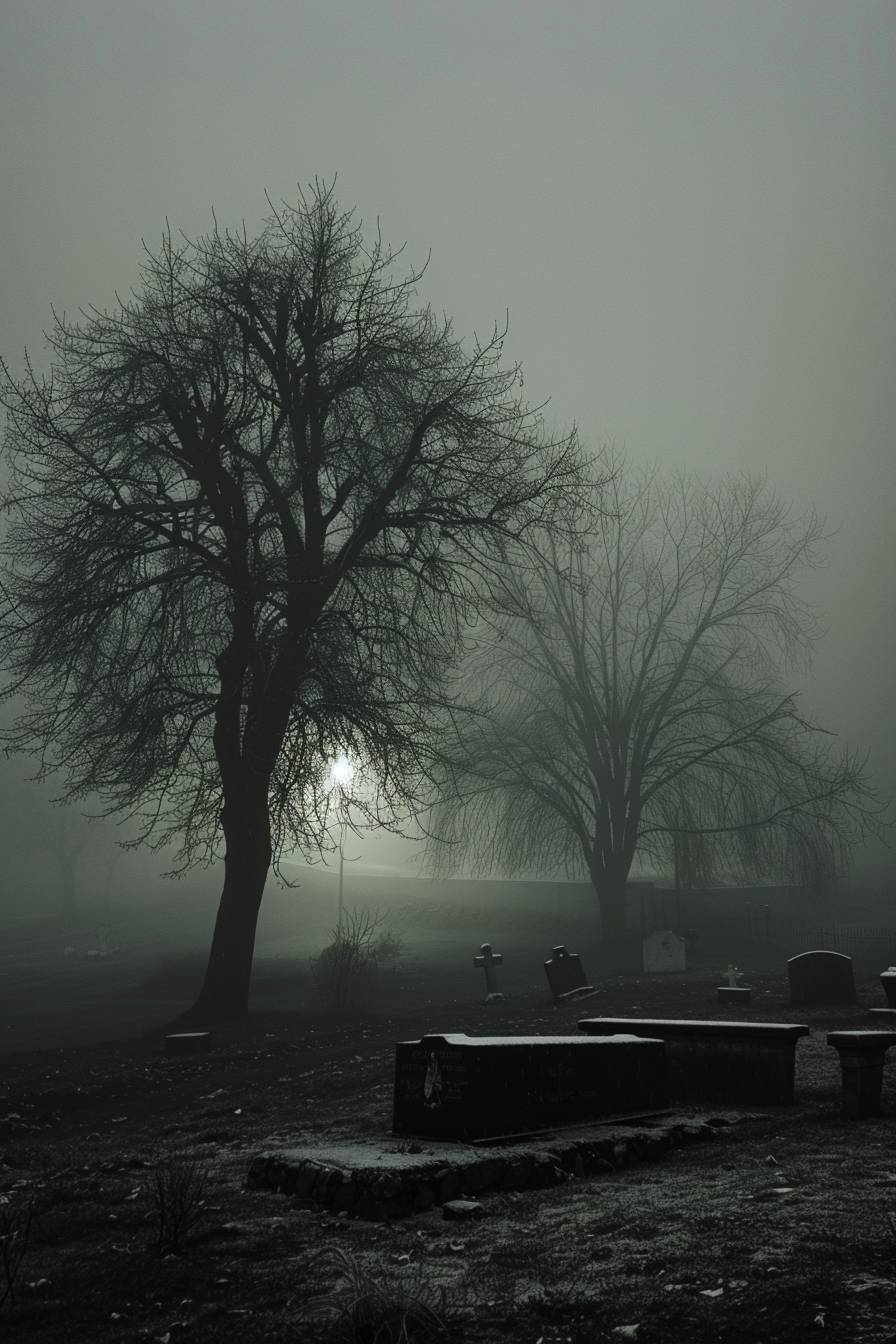 In the style of Akos Major, haunted graveyard on a foggy night