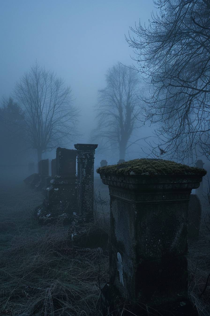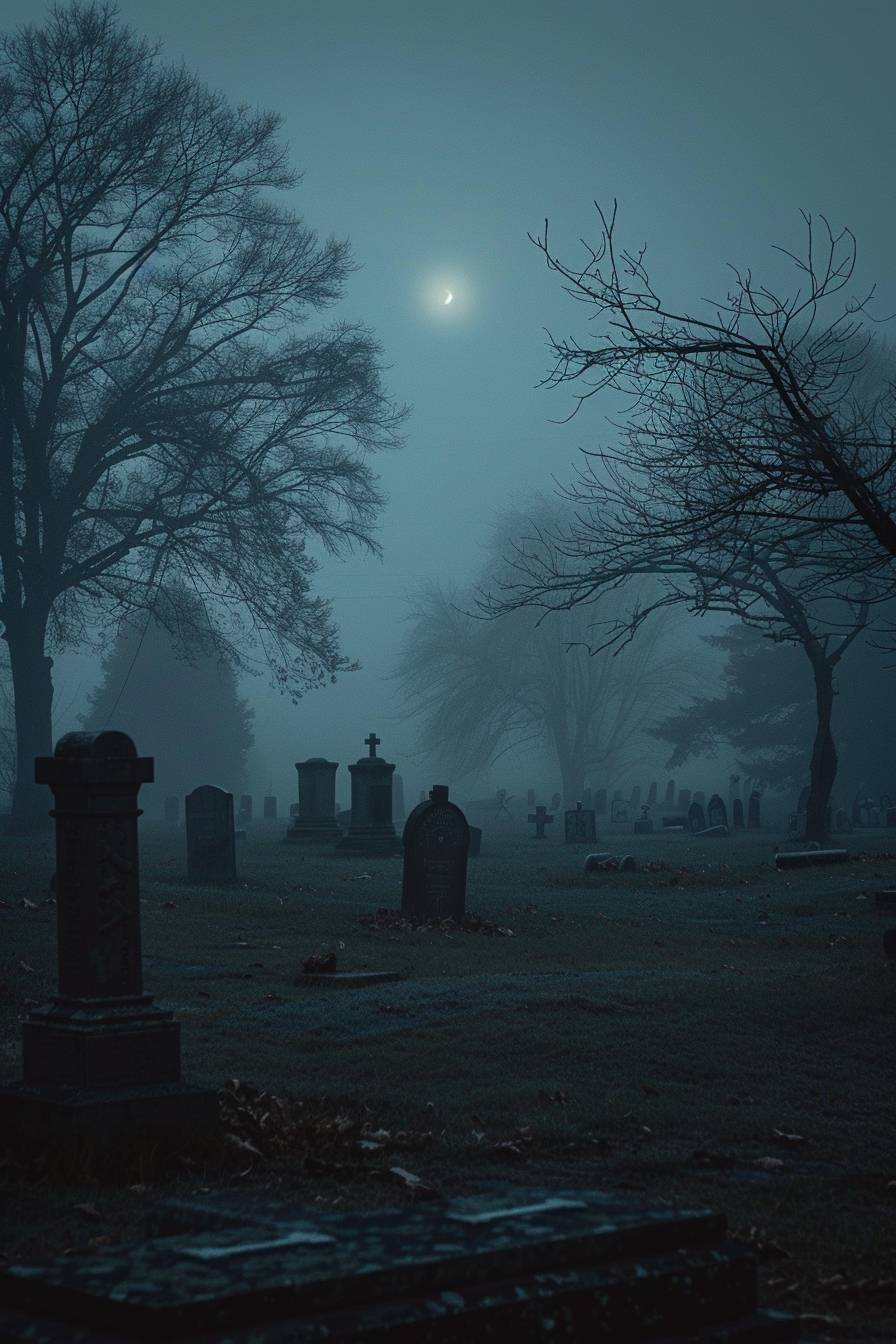 in style of Akos Major,Haunted graveyard on a foggy night --ar 2:3 --v 6.0