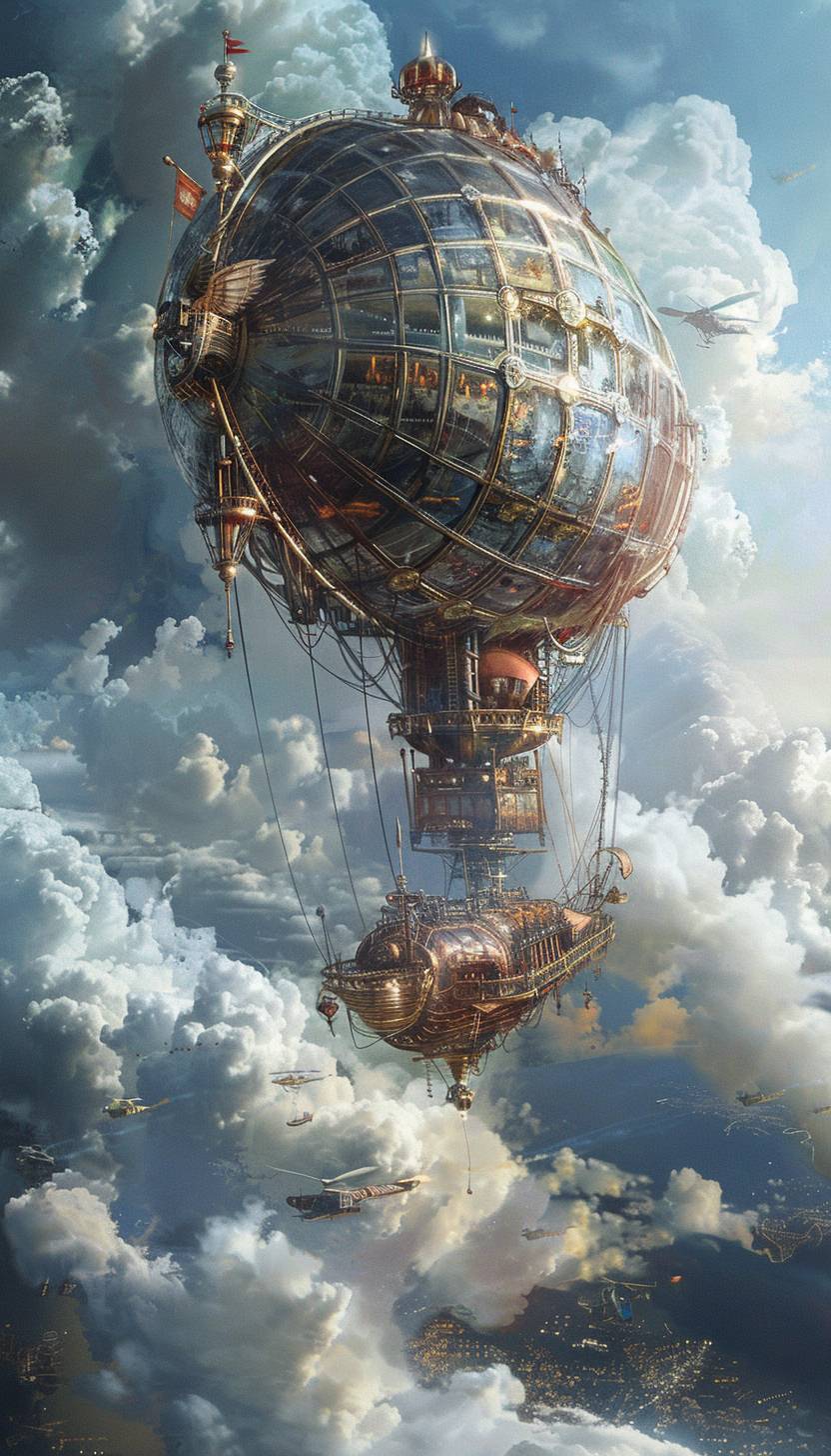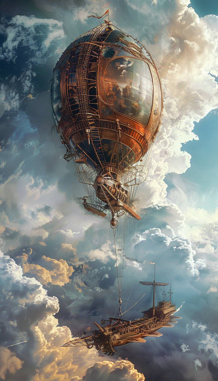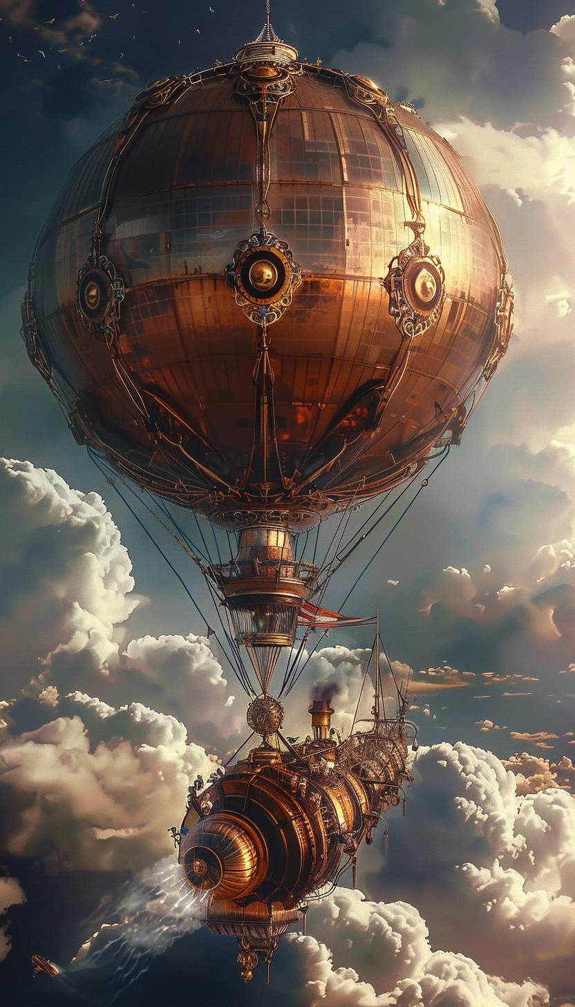 Steampunk airship gliding through the clouds