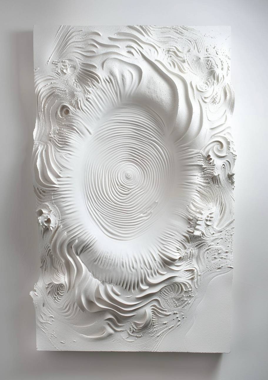 A large white wall sculpture made of plaster with an oval shape, filled in the center and shaped like one human fingerprint, surrounded by a series of small spiral shapes that resemble fingers. The entire piece is presented on a clean background, creating a minimalist yet striking visual effect. This artwork has been designed to convey depth through its three-dimensional form, while also adding intricate details for decorative purposes. The sculpture is in the style of minimalism. --ar 70:99 --style raw --v 6.0