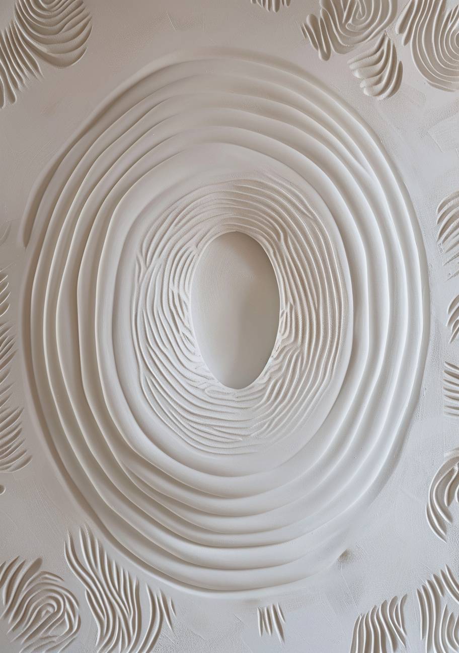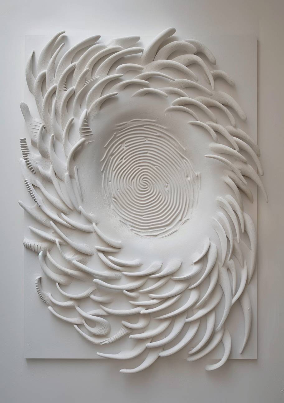 A large white wall sculpture made of plaster, oval in shape, filled in the center and shaped like a human fingerprint, surrounded by a series of small spiral shapes that resemble fingers. The entire piece is presented on a clean background, creating a minimalist yet striking visual effect. This artwork has been designed to convey depth through its three-dimensional form while adding intricate details for decorative purposes. The sculpture is in the style of minimalism.