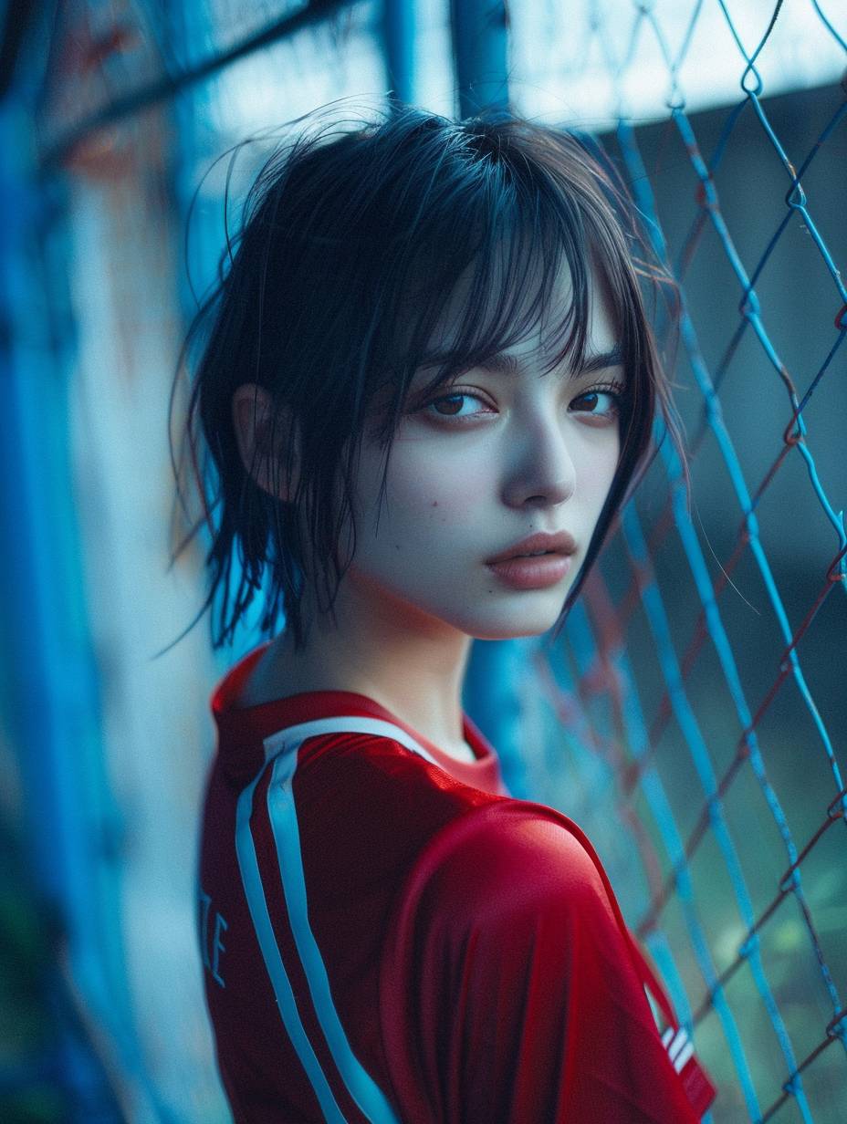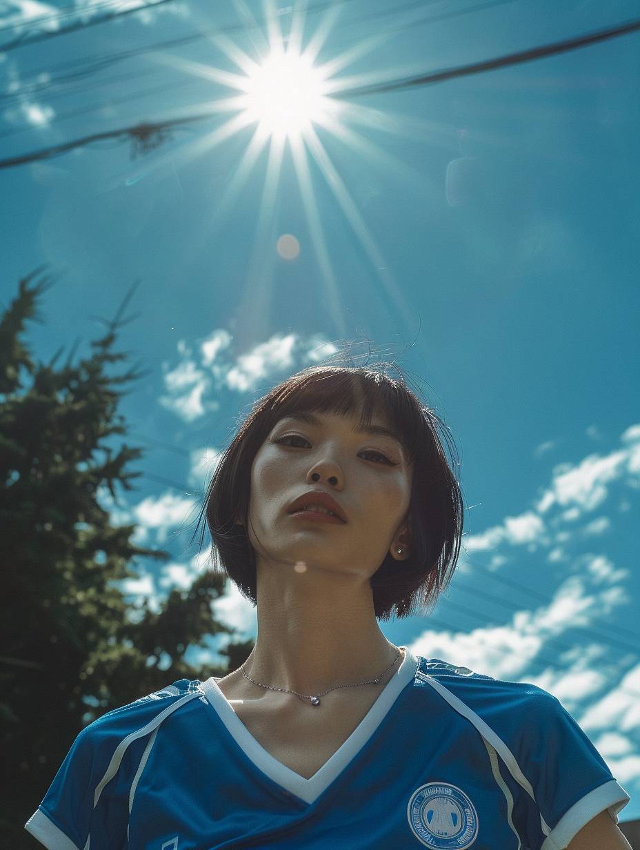 Female soccer jersey Astral of young Beautiful japan priest Blue short hair girl with striking Eyes and pouty lips, white skin.interplay of light and shadow.Dramatic composition. Solarium, shotting by fuji xt-5, sharp photography, intricate details --ar 3:4 --v 6.0