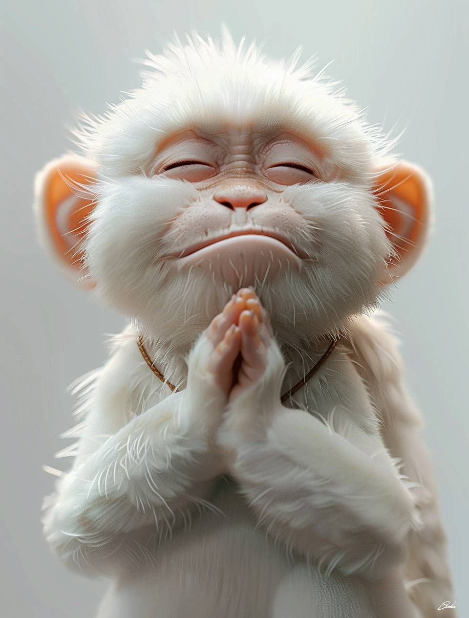 A cute white monkey with a chubby body and smiling expression, eyes closed and hands clasped together in prayer on its chest. A pure style background with a white clean wall. White fur all over its body, white ears, and a white tail. Anime style and Pixar art style. --ar 97:128 --v 6.0