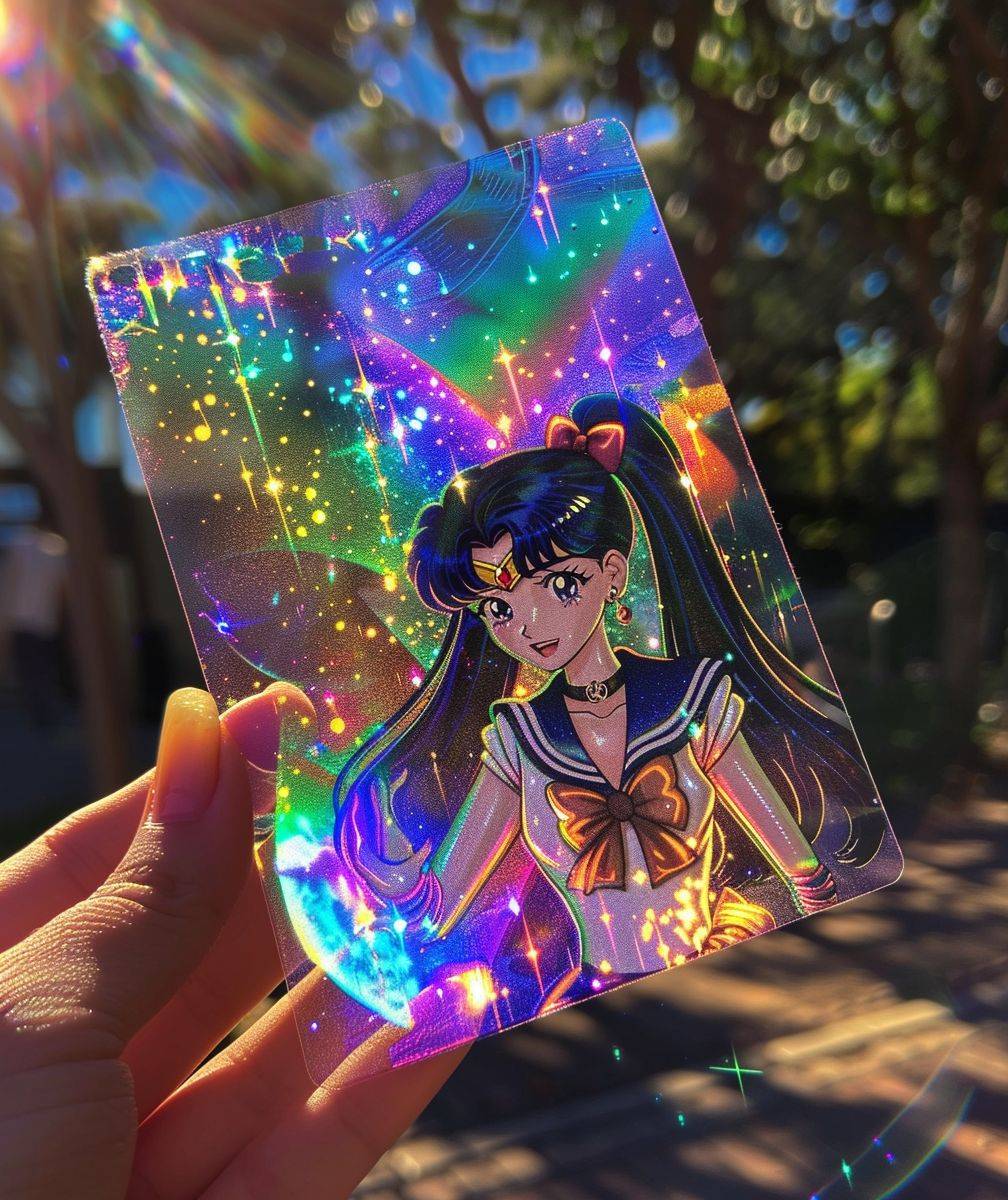a beautiful manga drawing card holographic of a girl in a magical background from sailor moon as a 1986 anime tv show screenshot nineties anime style, being held in a real hand --style raw --ar 16:19