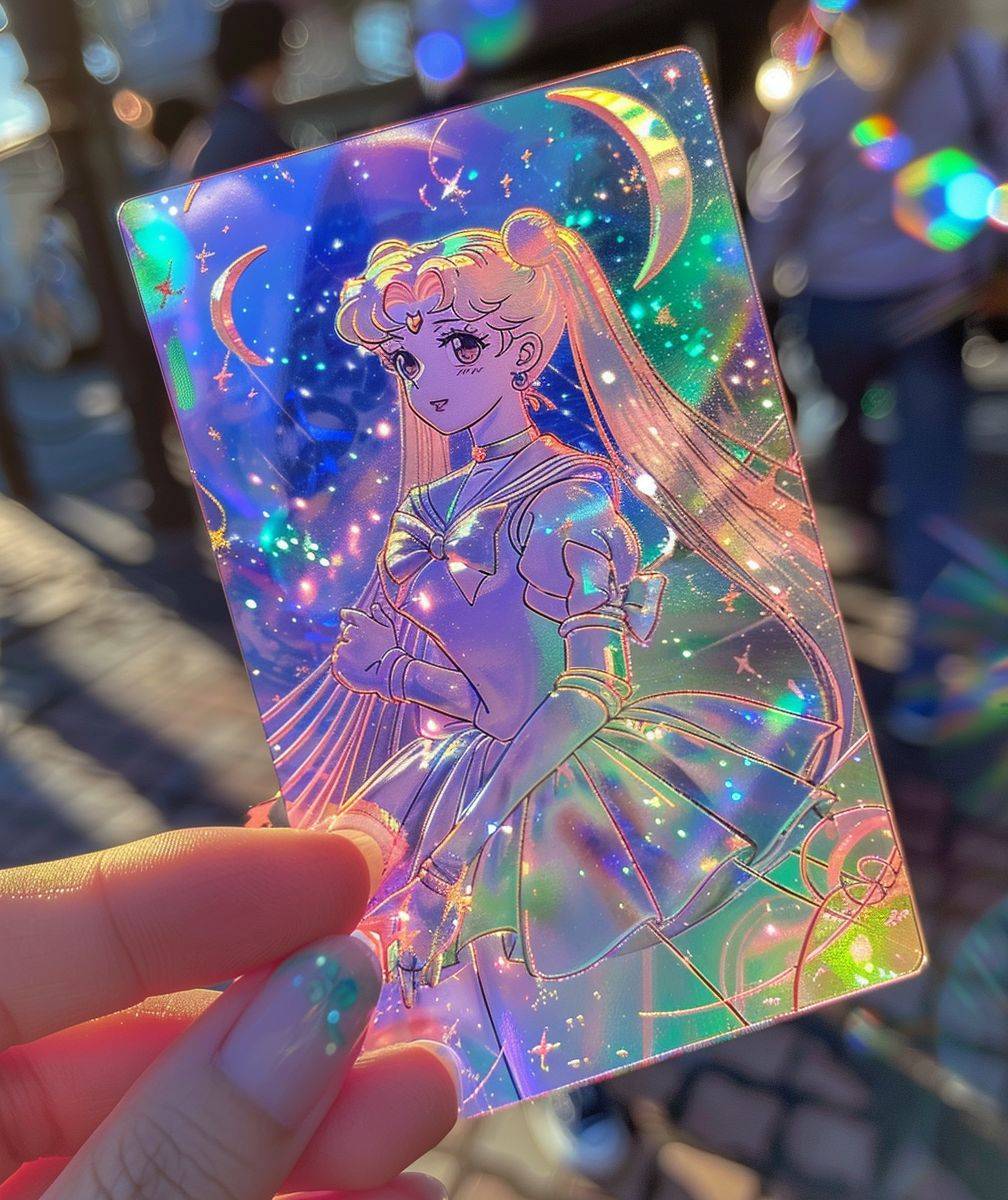 A beautiful manga drawing card featuring a girl in a magical background from Sailor Moon in a 1990s anime style.