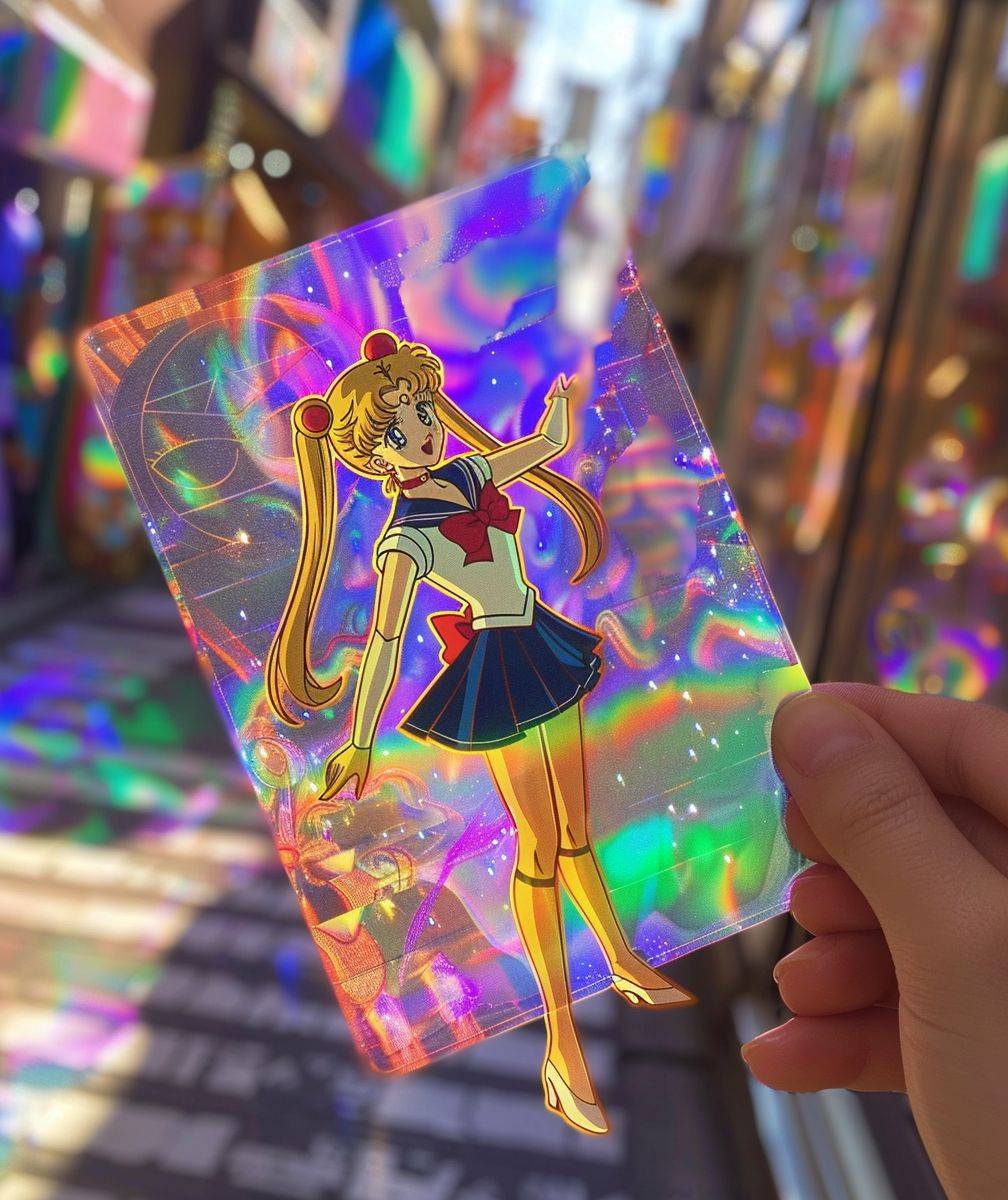 A beautiful manga drawing card holographic of a girl in a magical background inspired by Sailor Moon, as a 1986 anime TV show screenshot, in a nineties anime style, being held in a real hand.