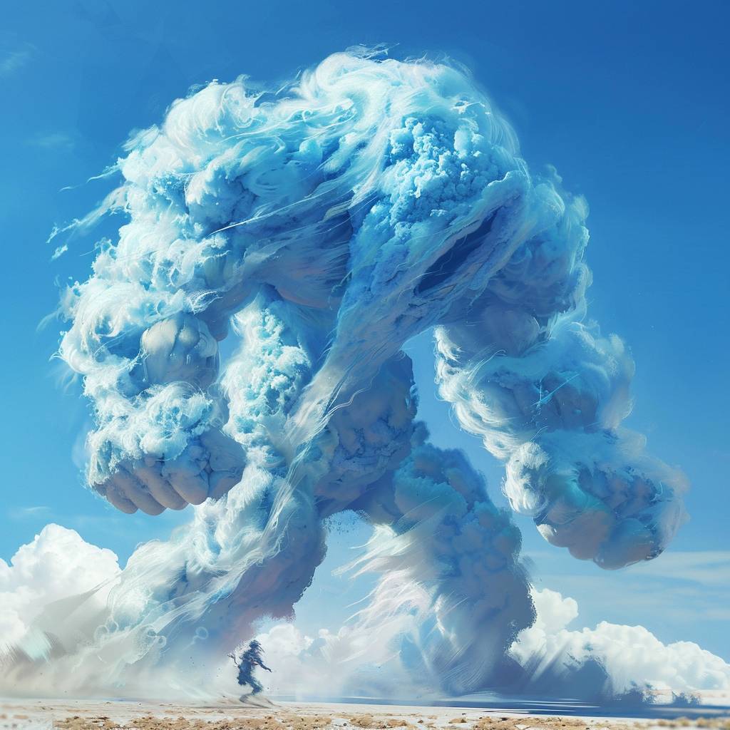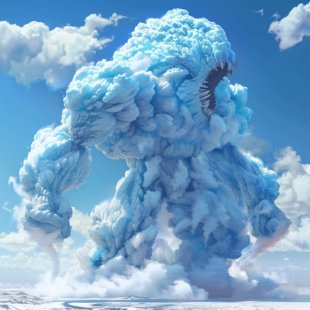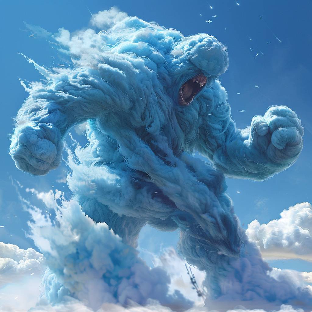 A giant humanoid, made of fluffy blue cotton candy, stomping on the ground and roaring to the sky, with a clear blue sky behind them.