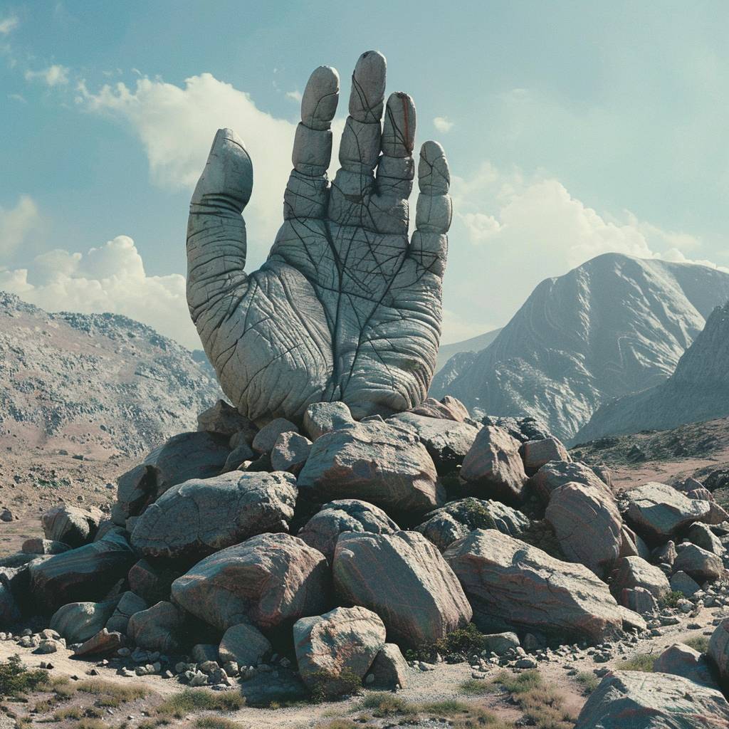 An ultra-wide shot of a giant stone hand reaching out of a pile of rocks at the base of a mountain. --v 6.0