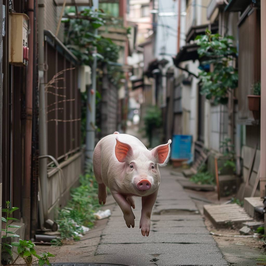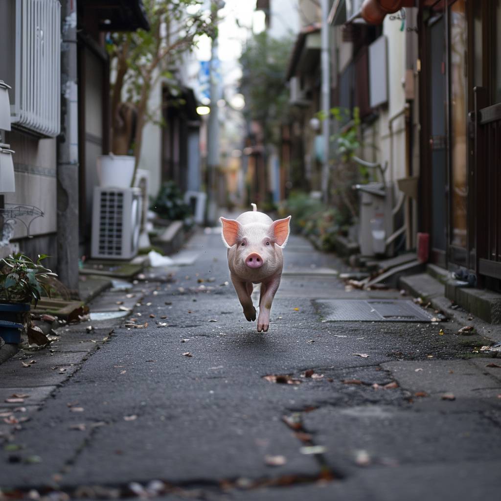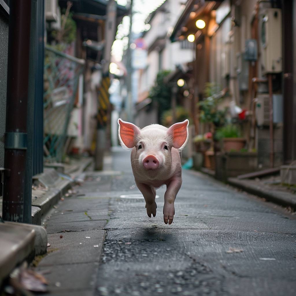 A pink pig running fast toward the camera in an alley in Tokyo.