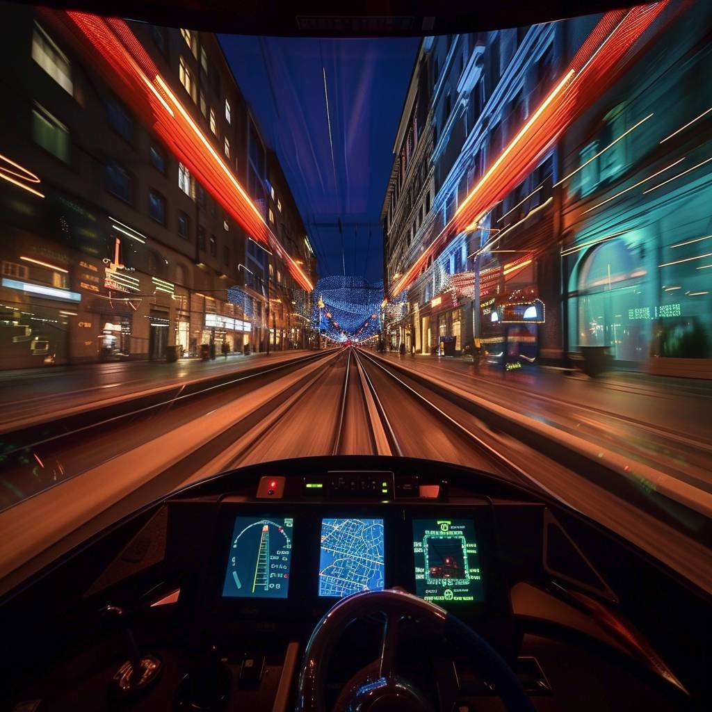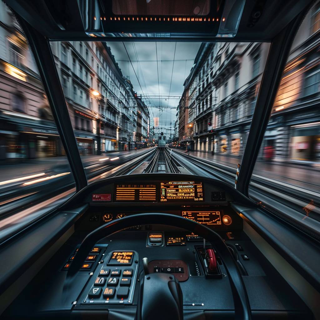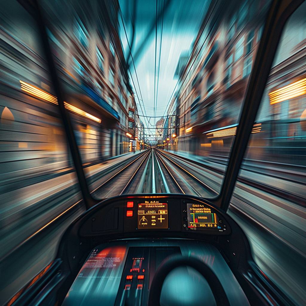 Internal view of a train moving at high speed in an old European city.