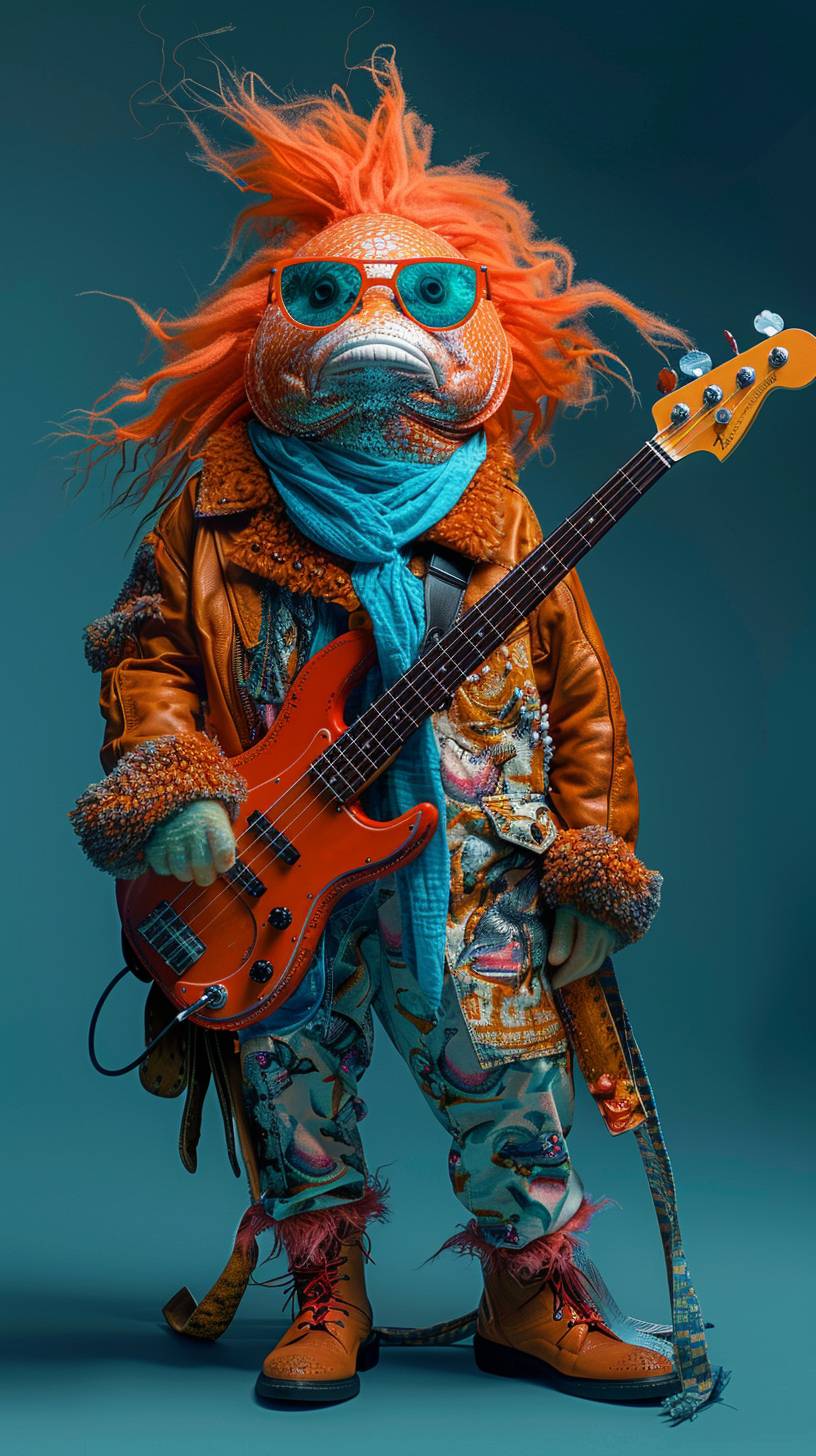 a wide shot of a fish with a punk hairstyle in orange, the fish is made of fluffy fur, orange , blue and brown colors, looks like a popstar, looking very straight to the camera, it wears sunglasses , wears aorange leather jacket and a neon blue neckerchief , gibson guitar in the hands, pattern mixed made of a collage, very filigran and graphic design optic, photostudio, blue backround, fashion photo shooting, --ar 9:16 --stylize 250 --v 6.0