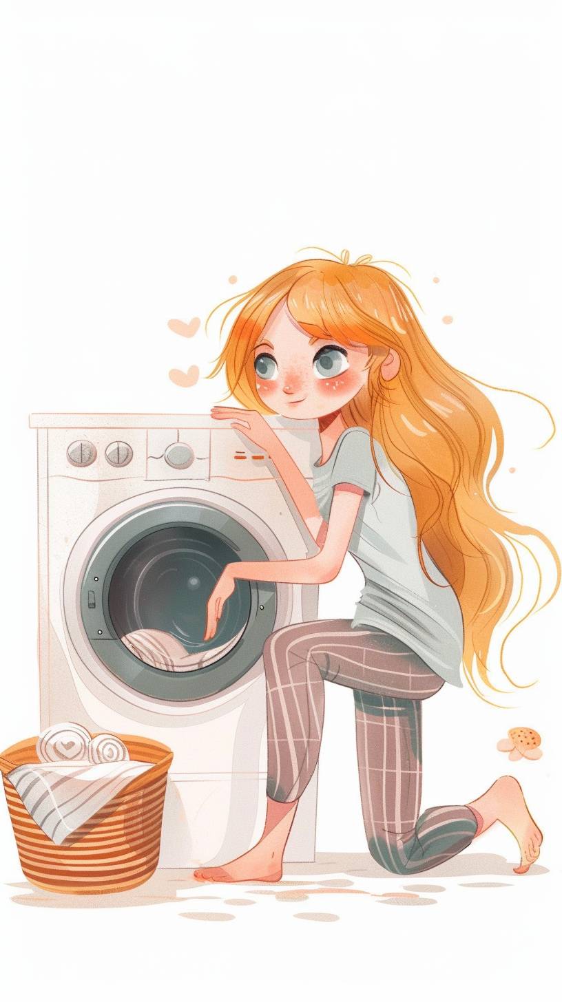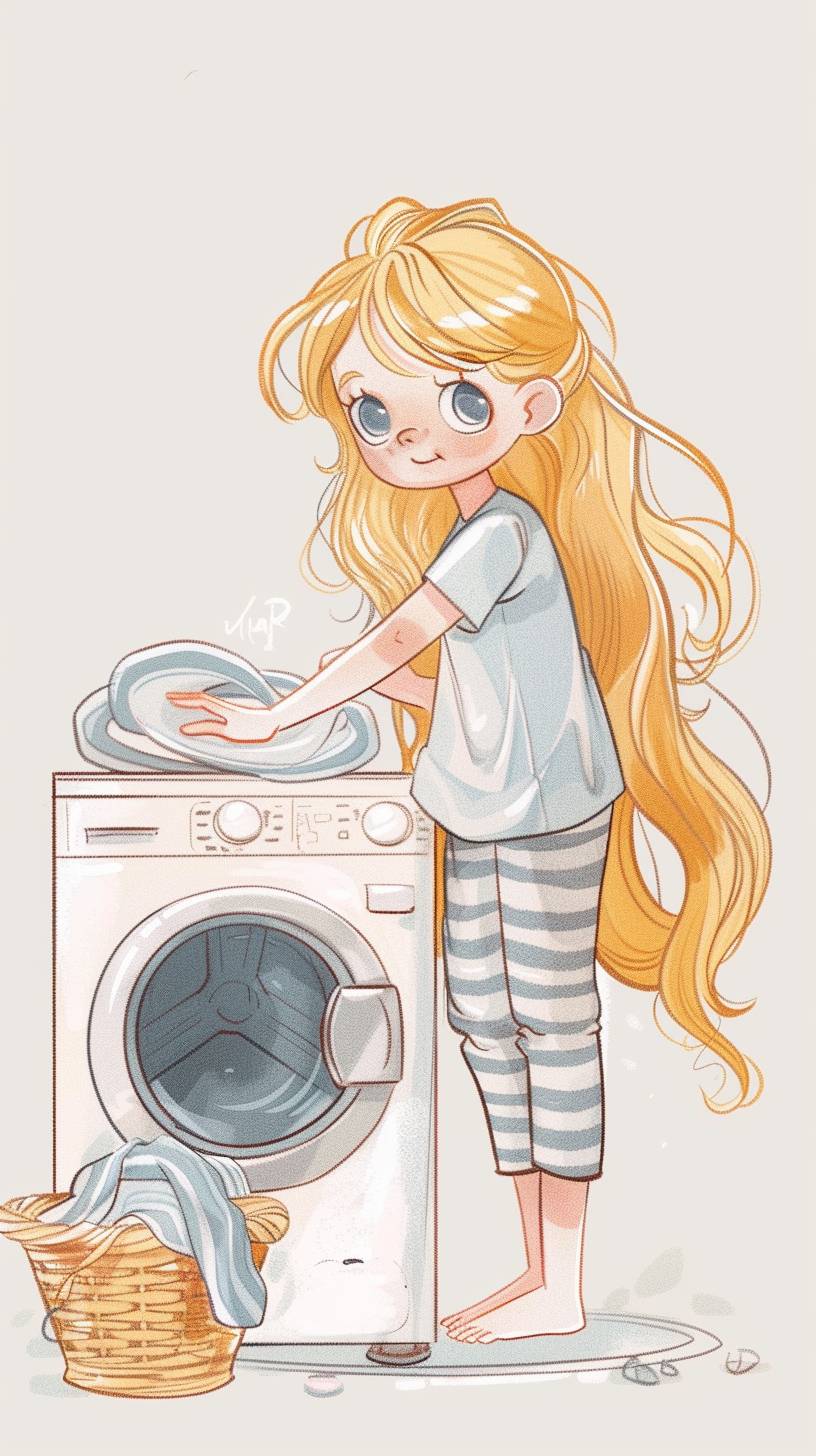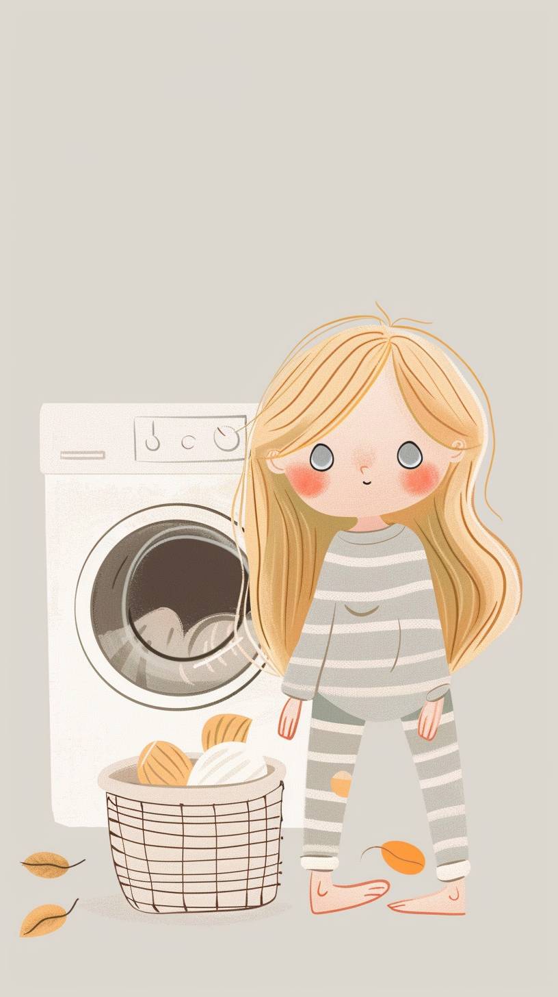 A girl is doing laundry. She has blonde hair and blue eyes, wearing striped pants. Next to the washing machine, there are in a basket. On her feet, it's a light grey background. The illustration style is flat with pastel colors. It is cute and simple with a white border, in the style of a light, pastel illustration. --ar 9:16 --v 6.0