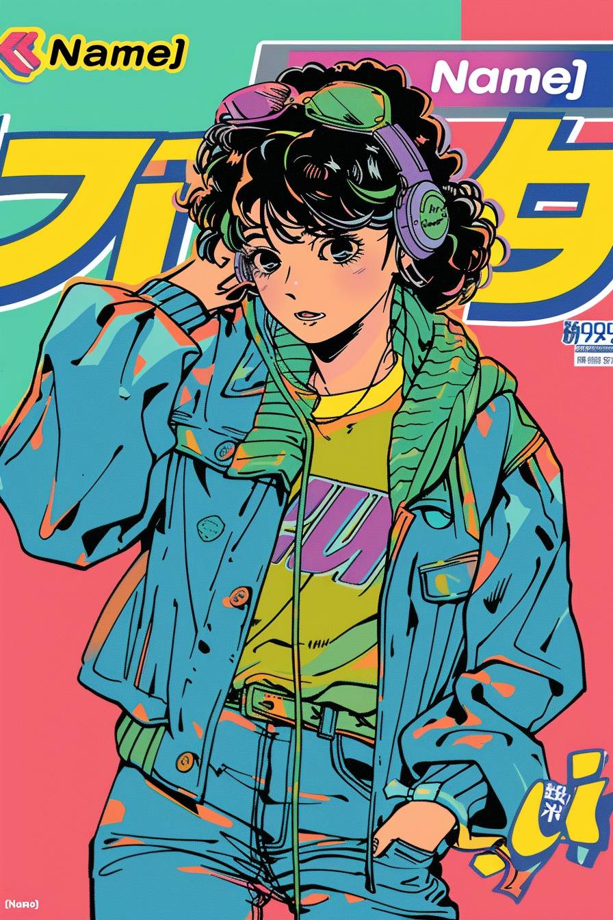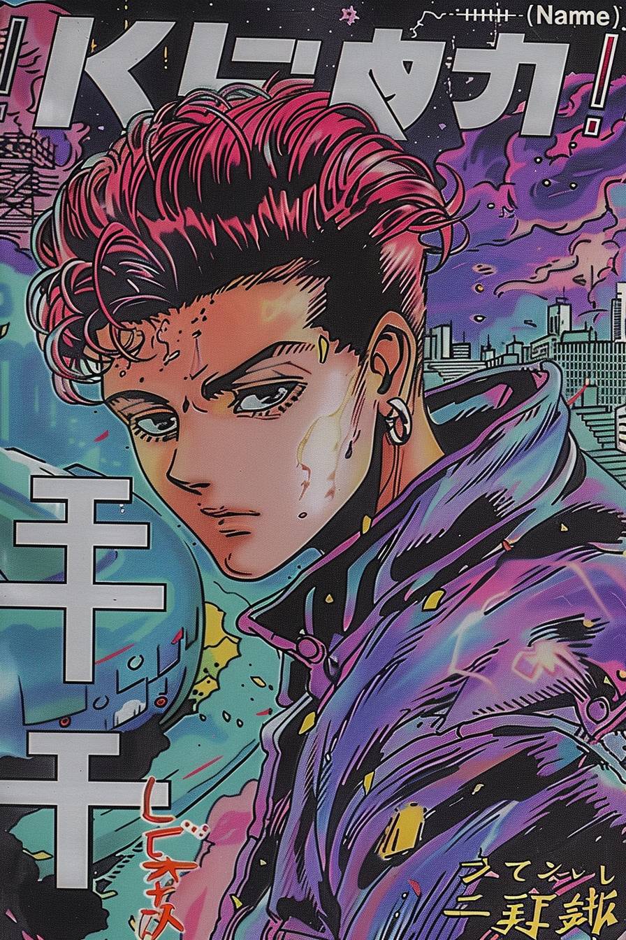 1990s manga style cover page of [Subject] with a trendy text manga title that says "[Name]", colorful --ar 2:3 --v 6.0