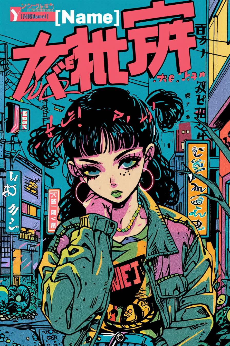 1990s manga style cover page of [Subject] with a trendy text manga title that says '[Name]', colorful.