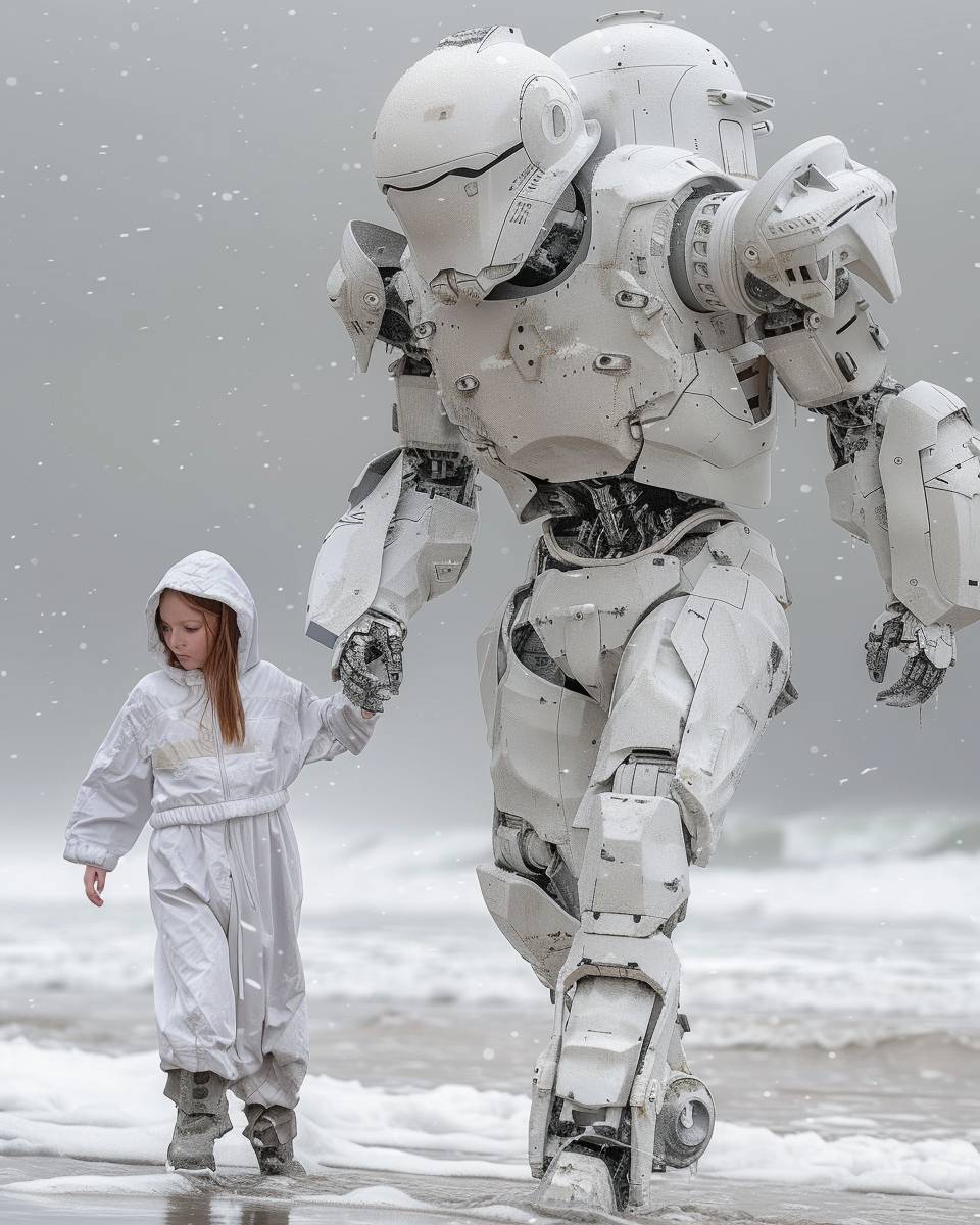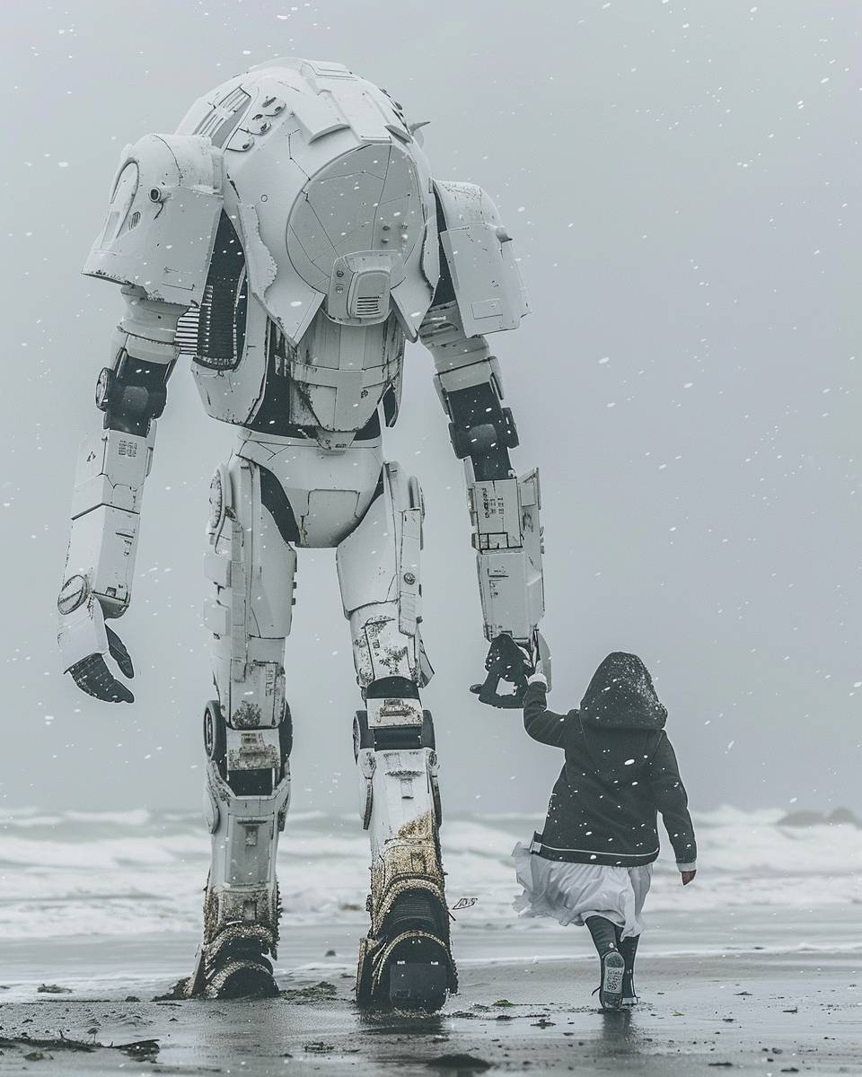 Photo of a white humanoid robot with full body armor and an extra large head walking on the beach in heavy snowfall, holding one hand by its side. It is wearing long pants, boots and has no helmet or mask on. Next to it walks a young girl dressed as Princess Leia from Star Wars, who also wears made out of trash materials and fabric. They both have weathered . The photo was taken using a Canon EOS R5 camera with an RF 80mm f/2 lens, creating a hyper realistic photograph in the style of a photograph. --ar 51:64 --v 6.0