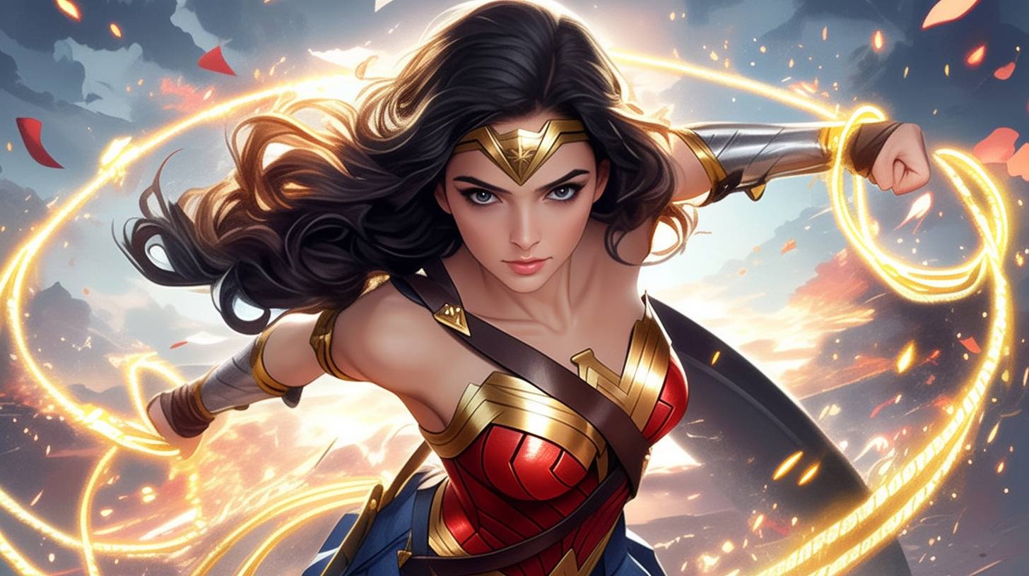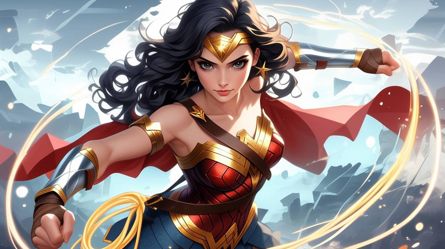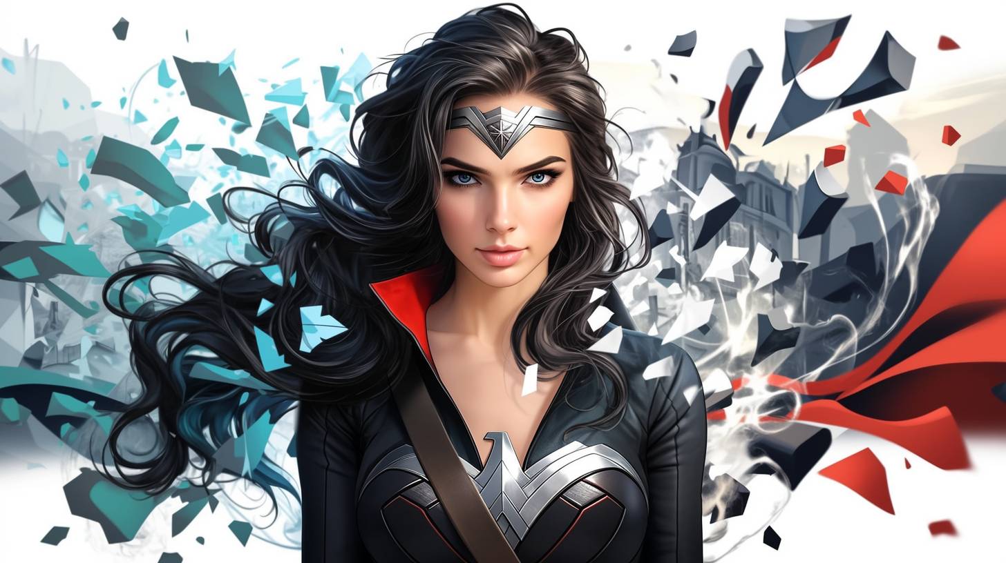 wonder woman, in the style of bold and graphic compositions, mosaic-like collages, pop culture mashup, multiple screens, light red and light bronze, magali villeneuve, macro zoom, outlandish energy, contemporary frescoes, chaotic academia, digital as manual --ar 16:9 --style raw --sref 1843964452 --stylize 1000 --niji 6