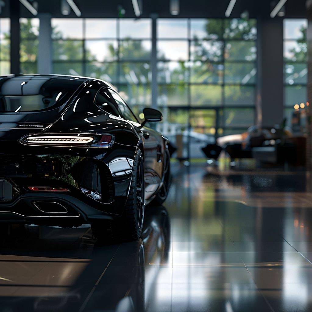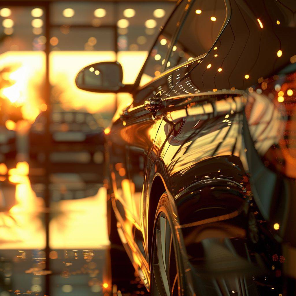 A car in a showroom illuminated by sunlight, featuring focus stacking, multi-layered design, rounded shapes, and neo-plasticist style, utilizing ue5 technology.