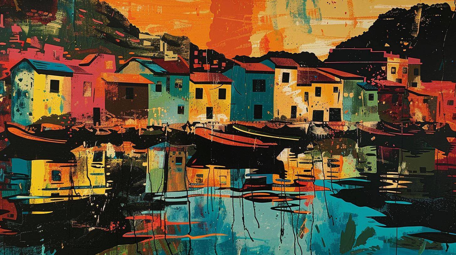 sunrise at a colorful fishing village by the harbour, rustic afrofuturism, reflections, sgraffito, strong visual flow