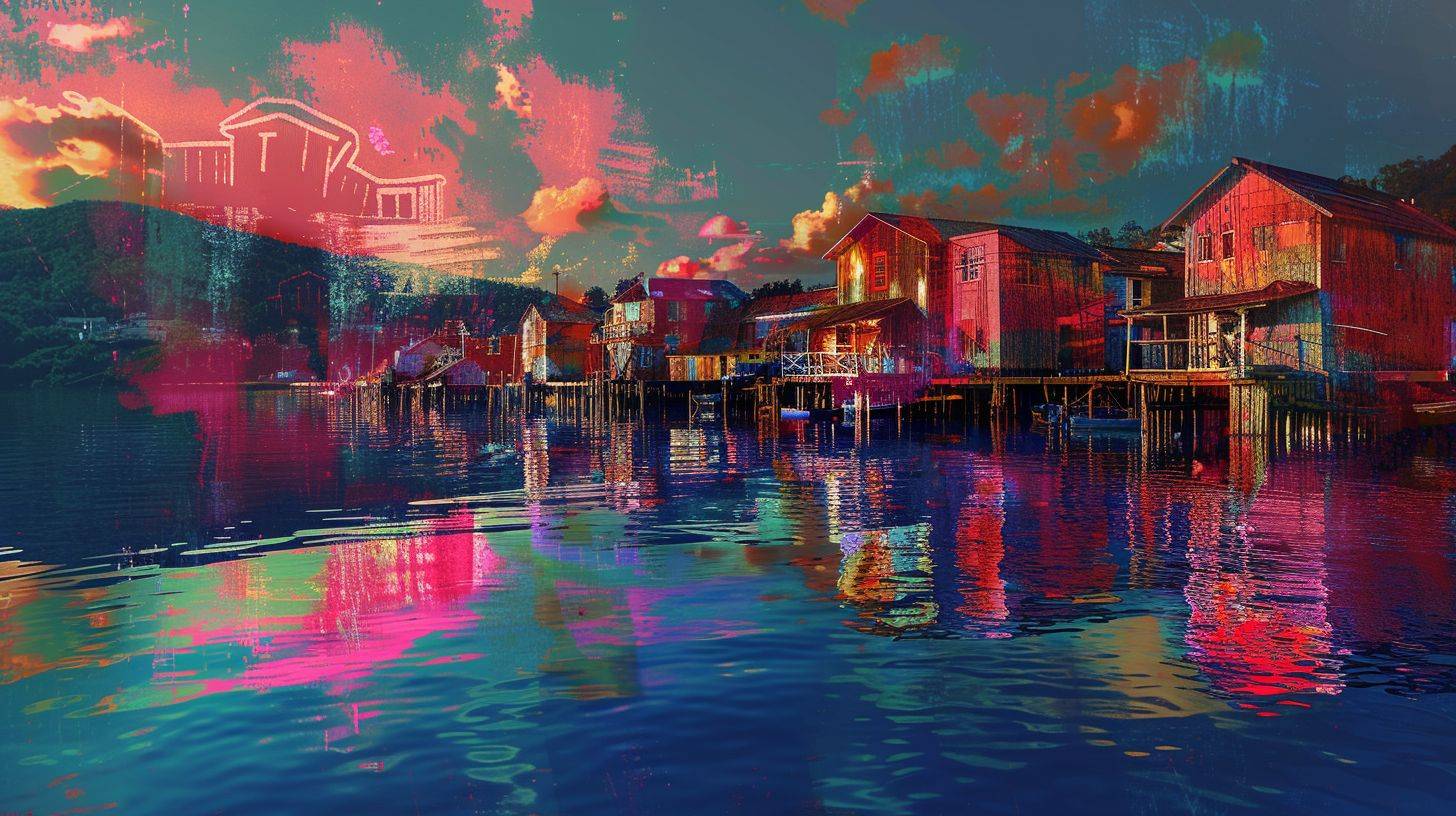 sunrise at a colourful fishing village by the harbour, rustic afrofuturism, reflections, sgraffito, strong visual flow --ar 16:9