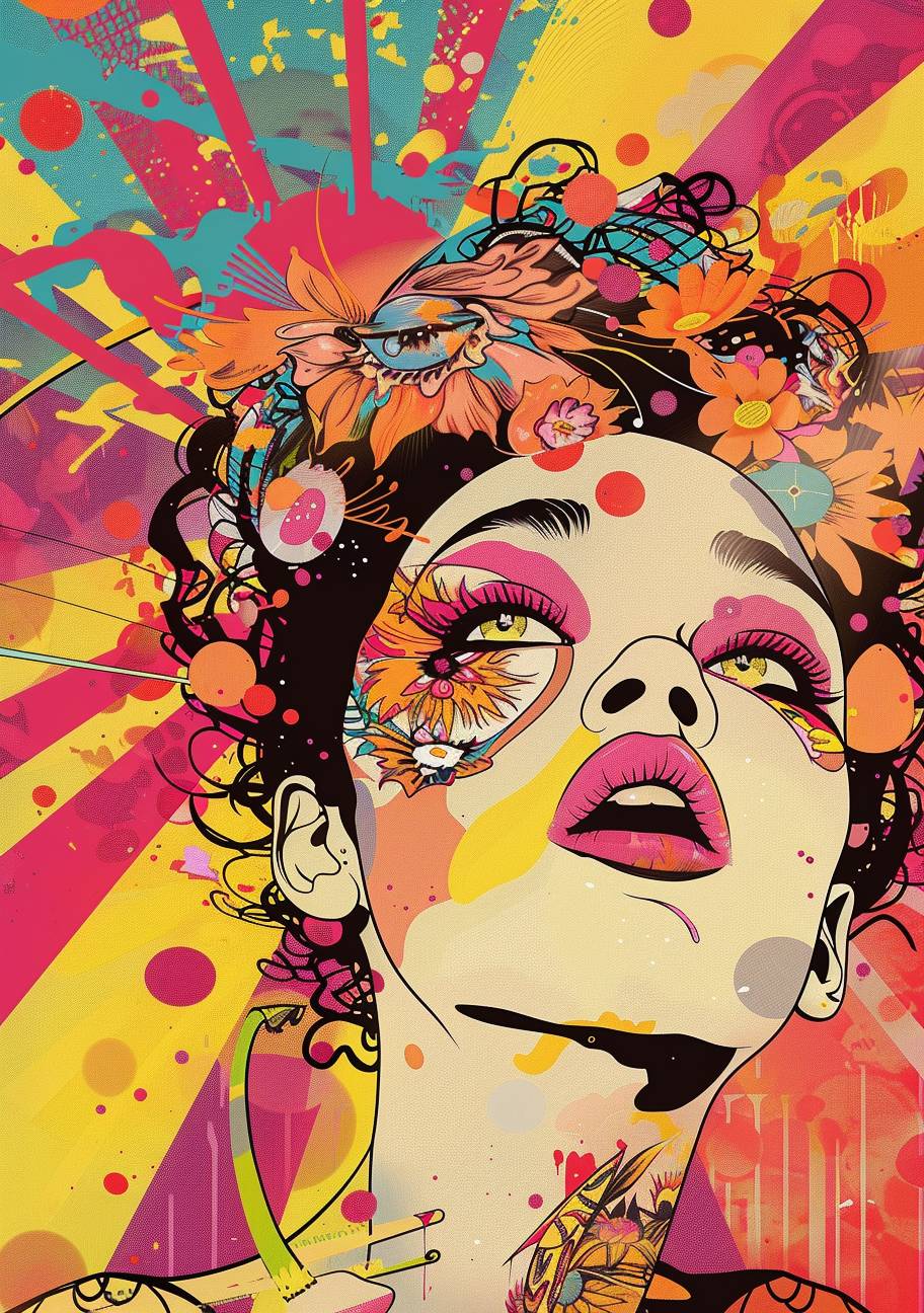 explosion artist cover, in the style of feminine pop art, unapologetic grit, concert poster, exotic, playful expressions, hyper-detailed illustrations, erudite --ar 70:99 --style raw --stylize 50 --v 6.0