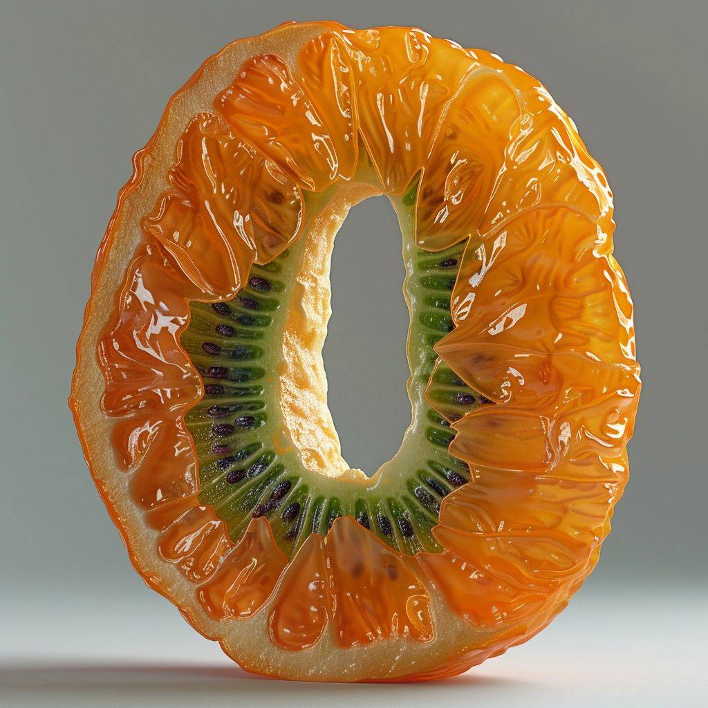 A hyper-realistic image showcasing an extraordinary piece of kiwi pulp, meticulously sculpted into an elaborate Letter O form. This single, standout pulp segment should be the central focus, with its Letter K-like contours and features exquisitely defined.