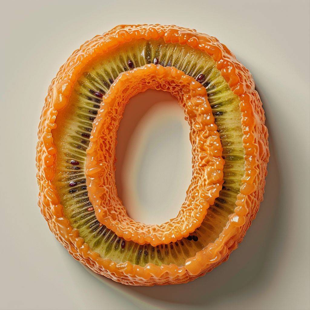hyper-realistic image showcasing an extraordinary piece of kiwi pulp, meticulously sculpted into an elaborate Letter O form. This single, standout pulp segment should be the central focus, with its Letter K-like contours and features exquisitely defined.