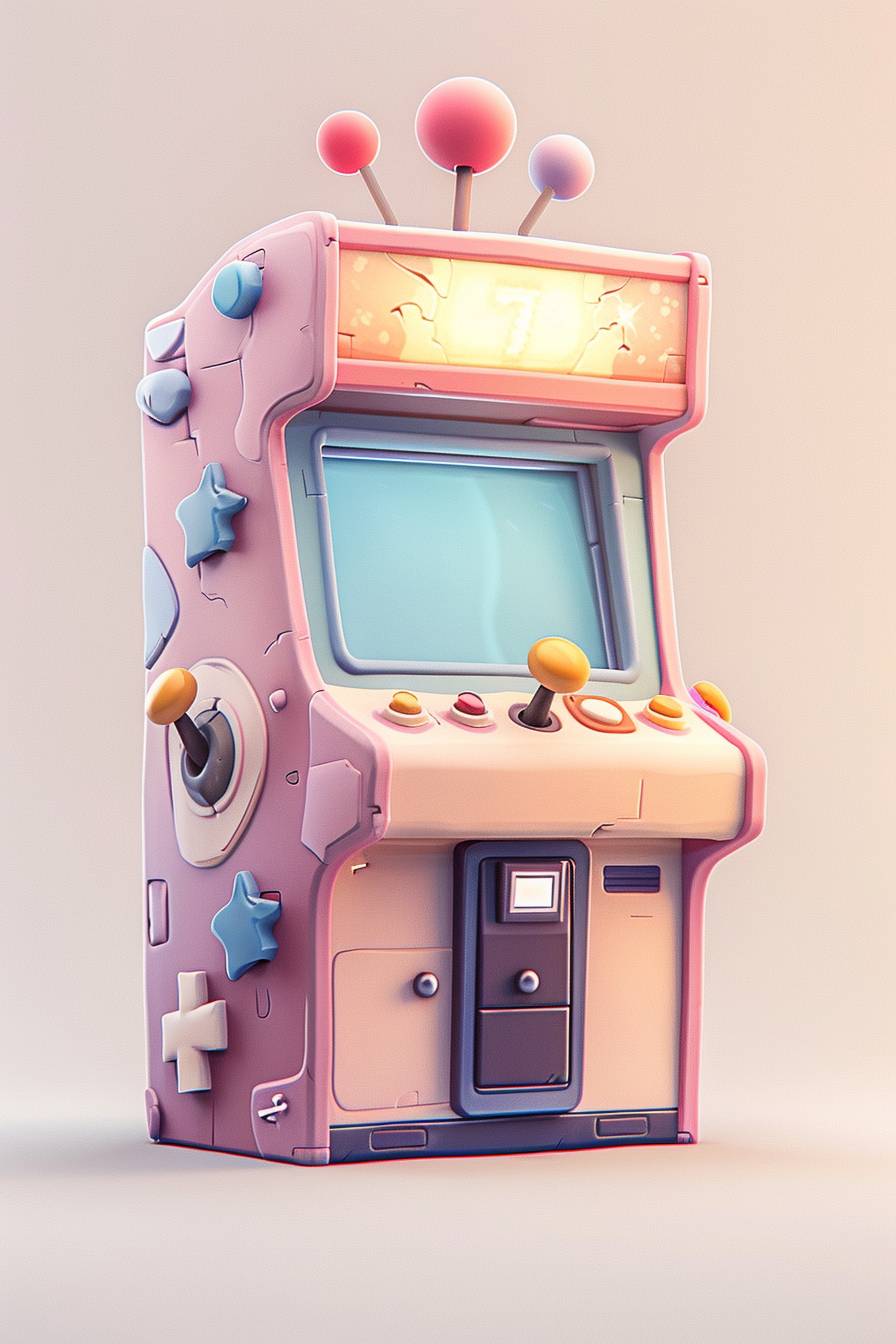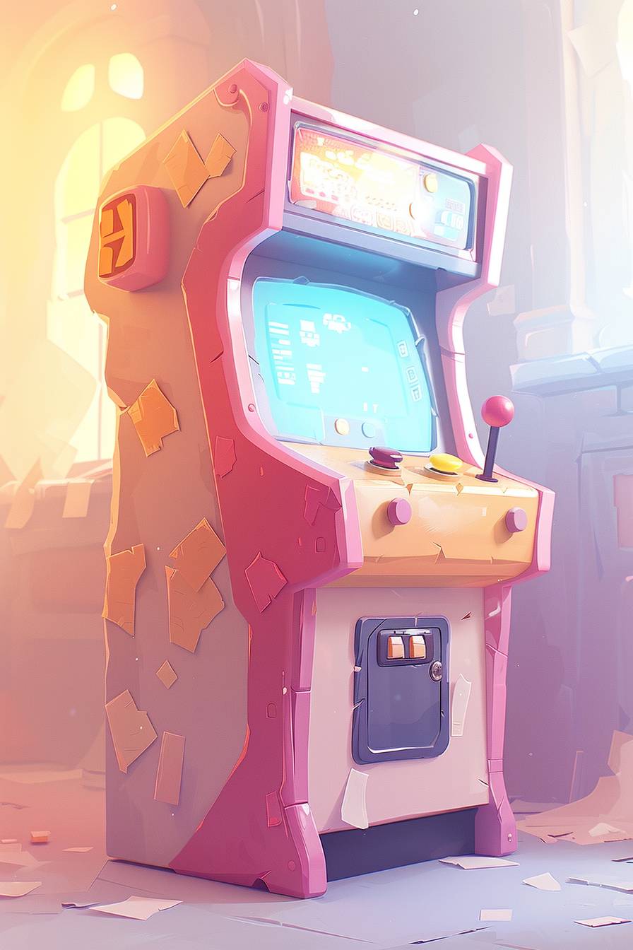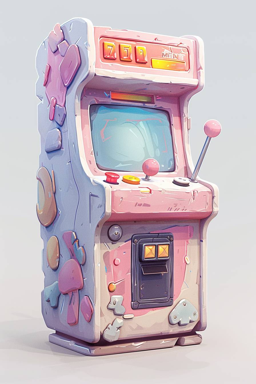a random colored, fighting arcade machine, with two sets of sticks and buttons (6), in an arcade room, isometric view, bright and colorfull --ar 2:3 --personalize ee4wxla --stylize 1000 --v 6.0