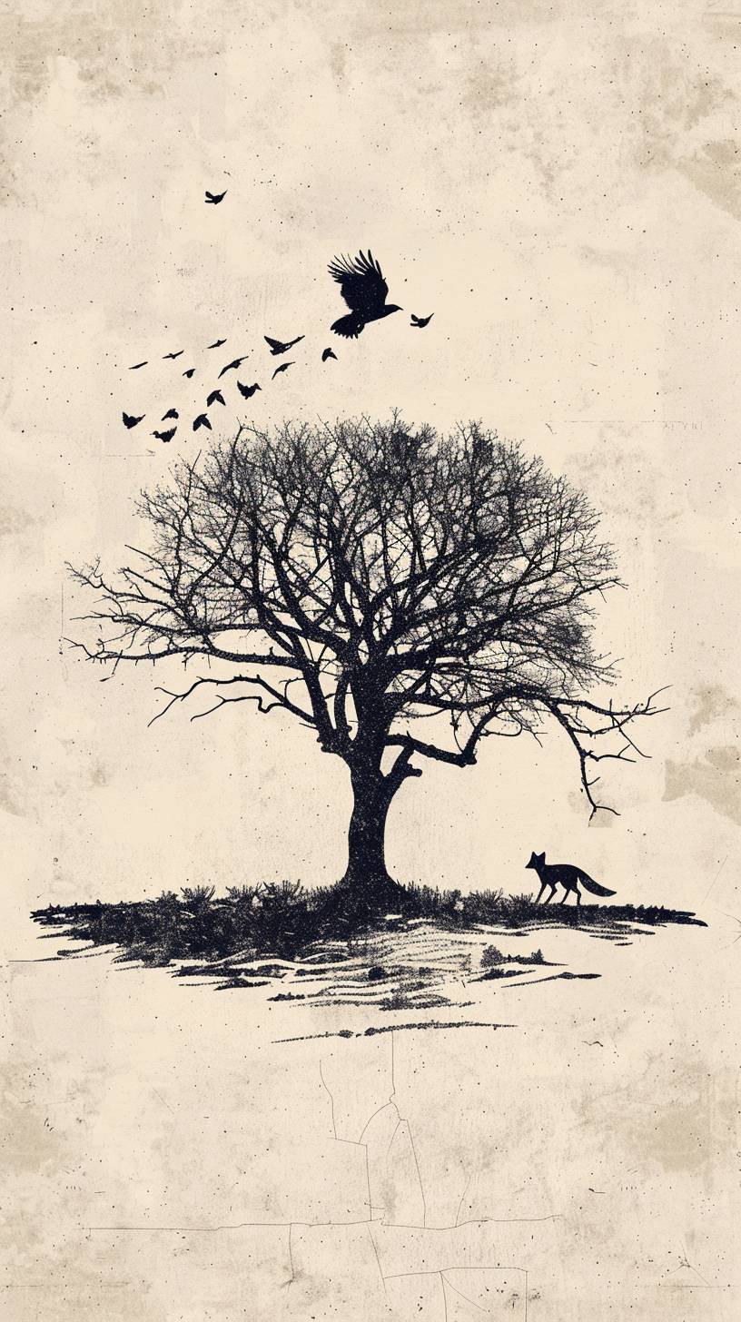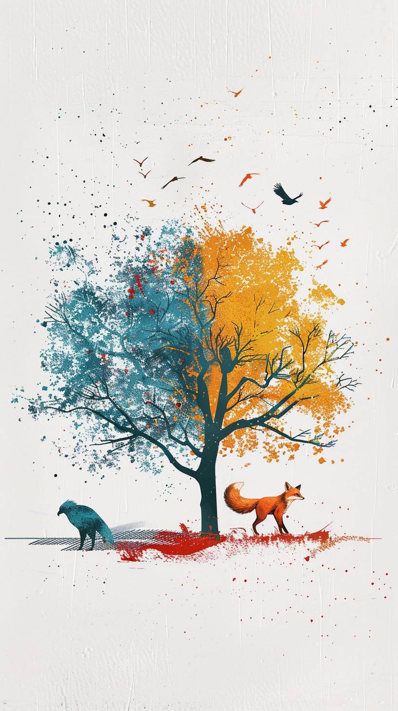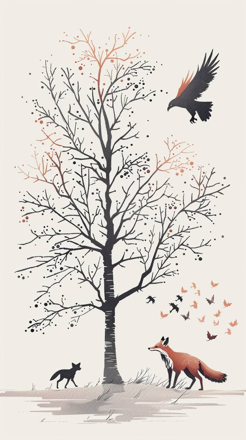 Minimalist illustration in color pointillism, eagle and fox walking towards a tree