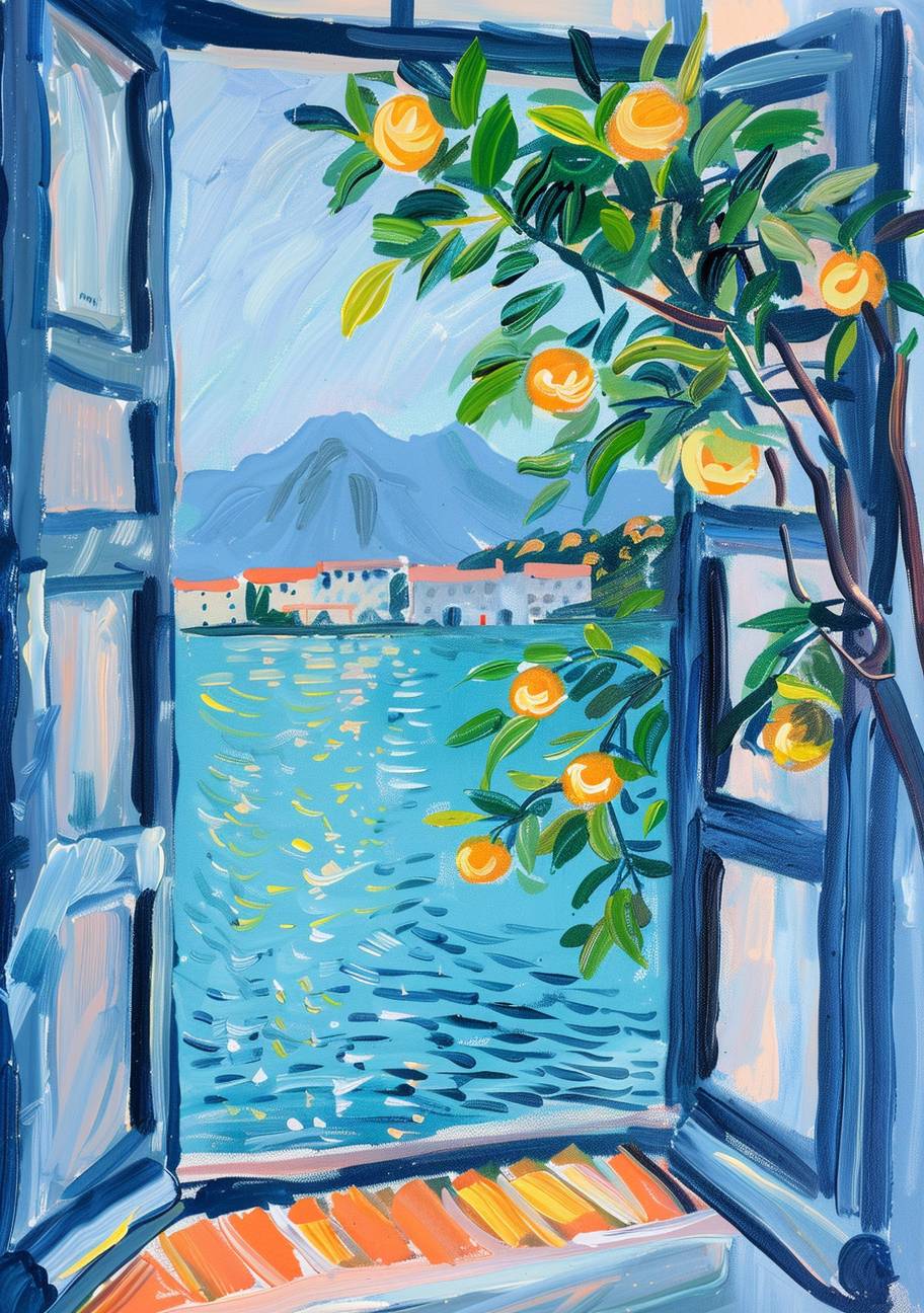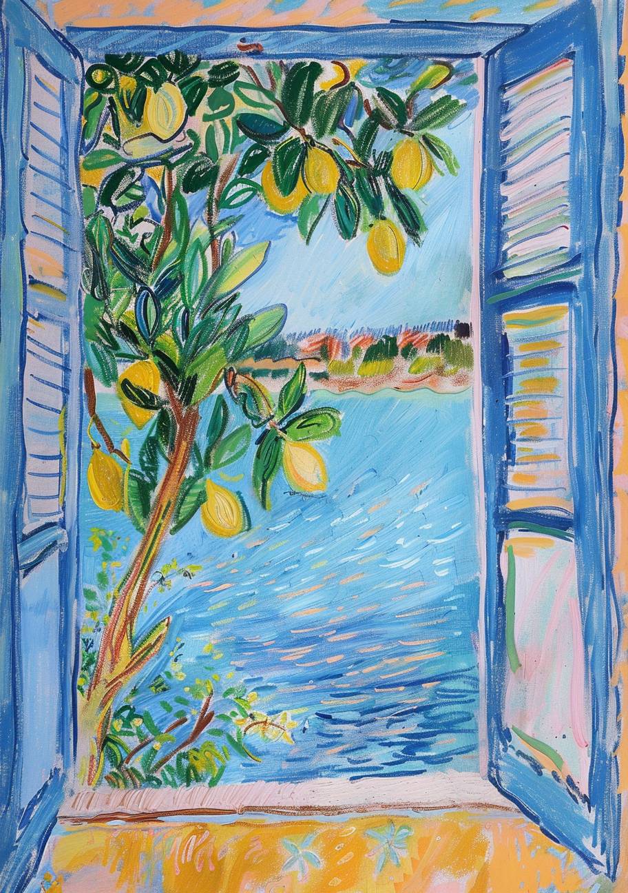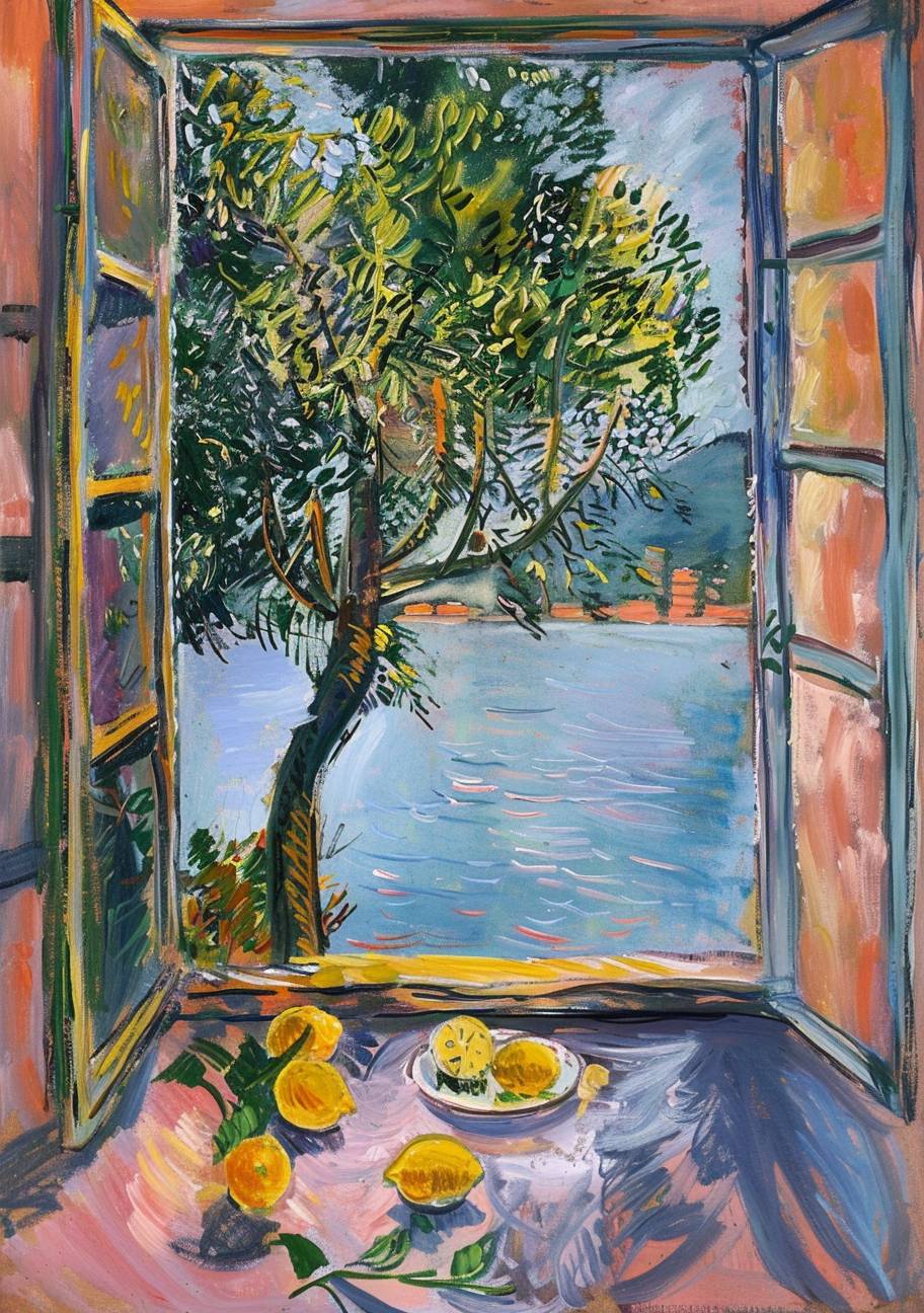 early Matisse, fauvism, calm lake view through an open window, pastel colors, lemon tree, capture the essence of a Mediterranean warm summer's day
