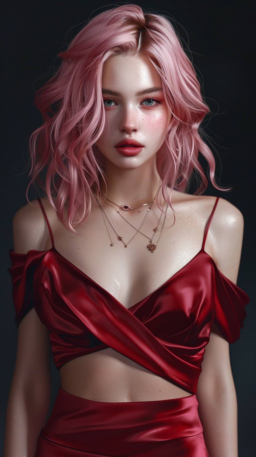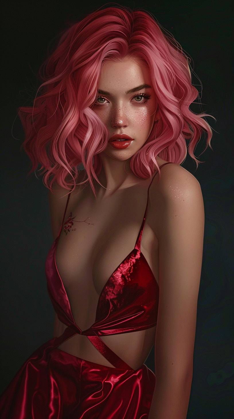 Create a hyper-realistic image of a young woman with wavy pink hair in a red satin dress.