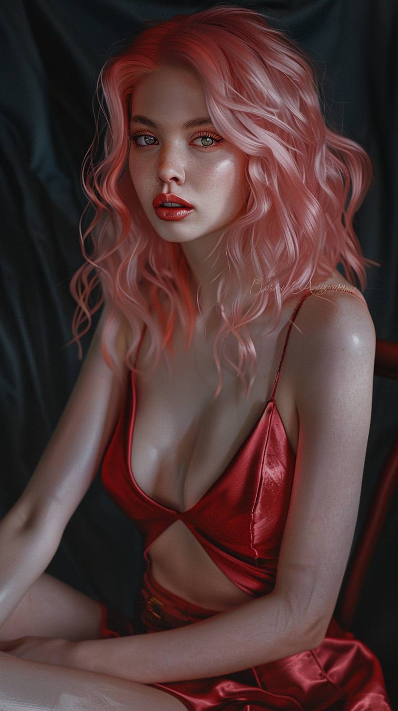 Create a hyper-realistic image of a young woman with wavy pink hair, wearing a satin red dress with a slit. The background should be dark, highlighting her features.