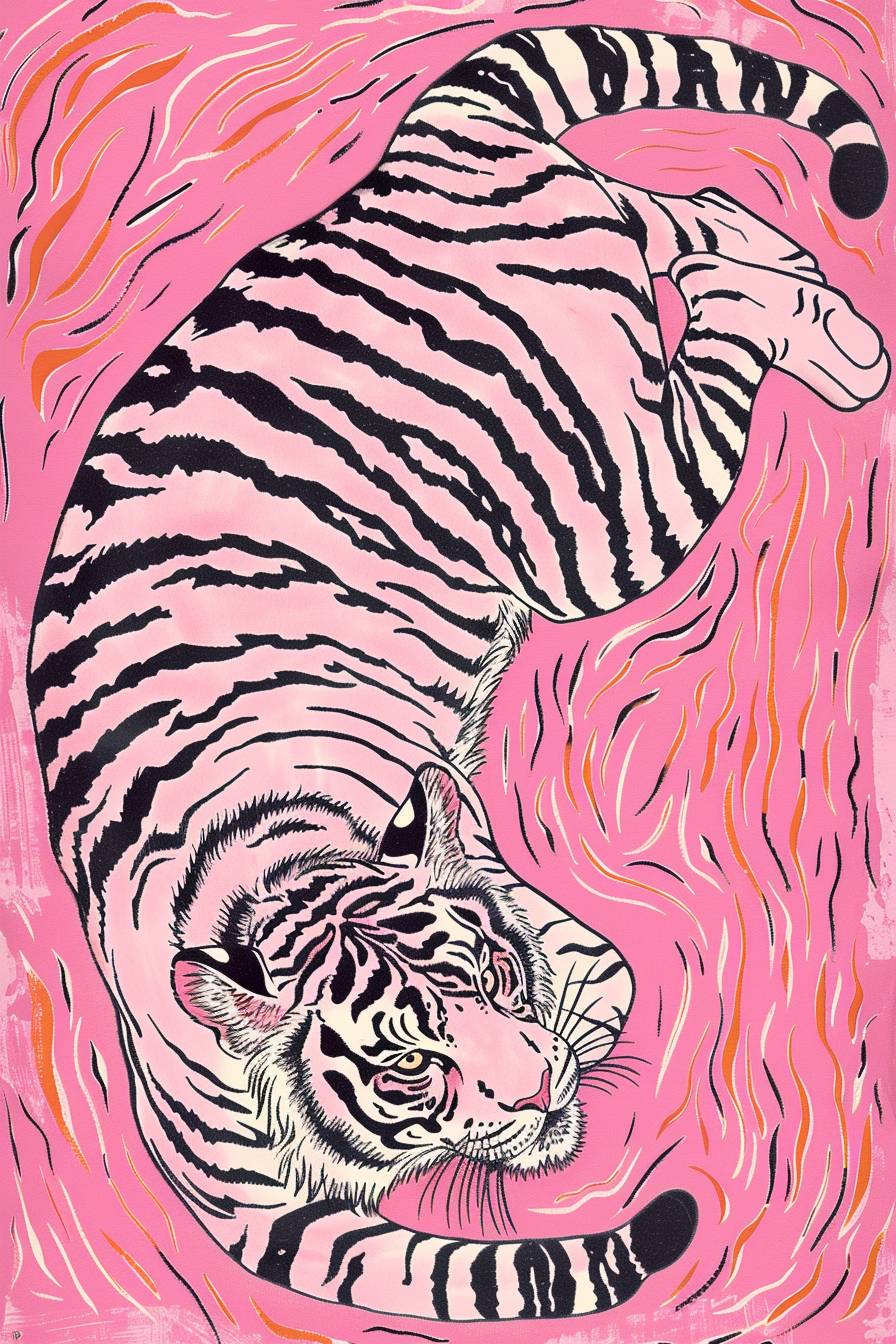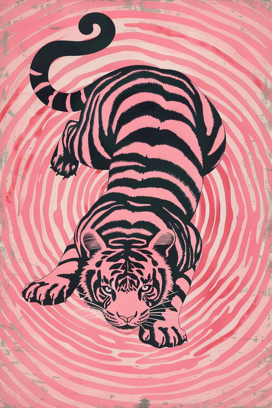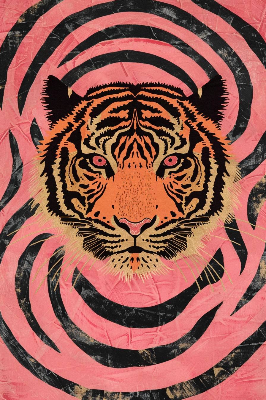 A tiger print with pink stripes in a symmetrical composition and spiral pattern in the style of Matisse, on a pink background in the style of Henri Michaux, view from above --ar 2:3 --v 6.0
