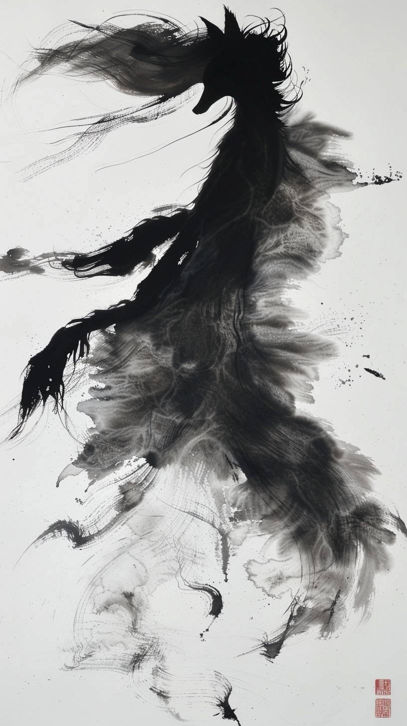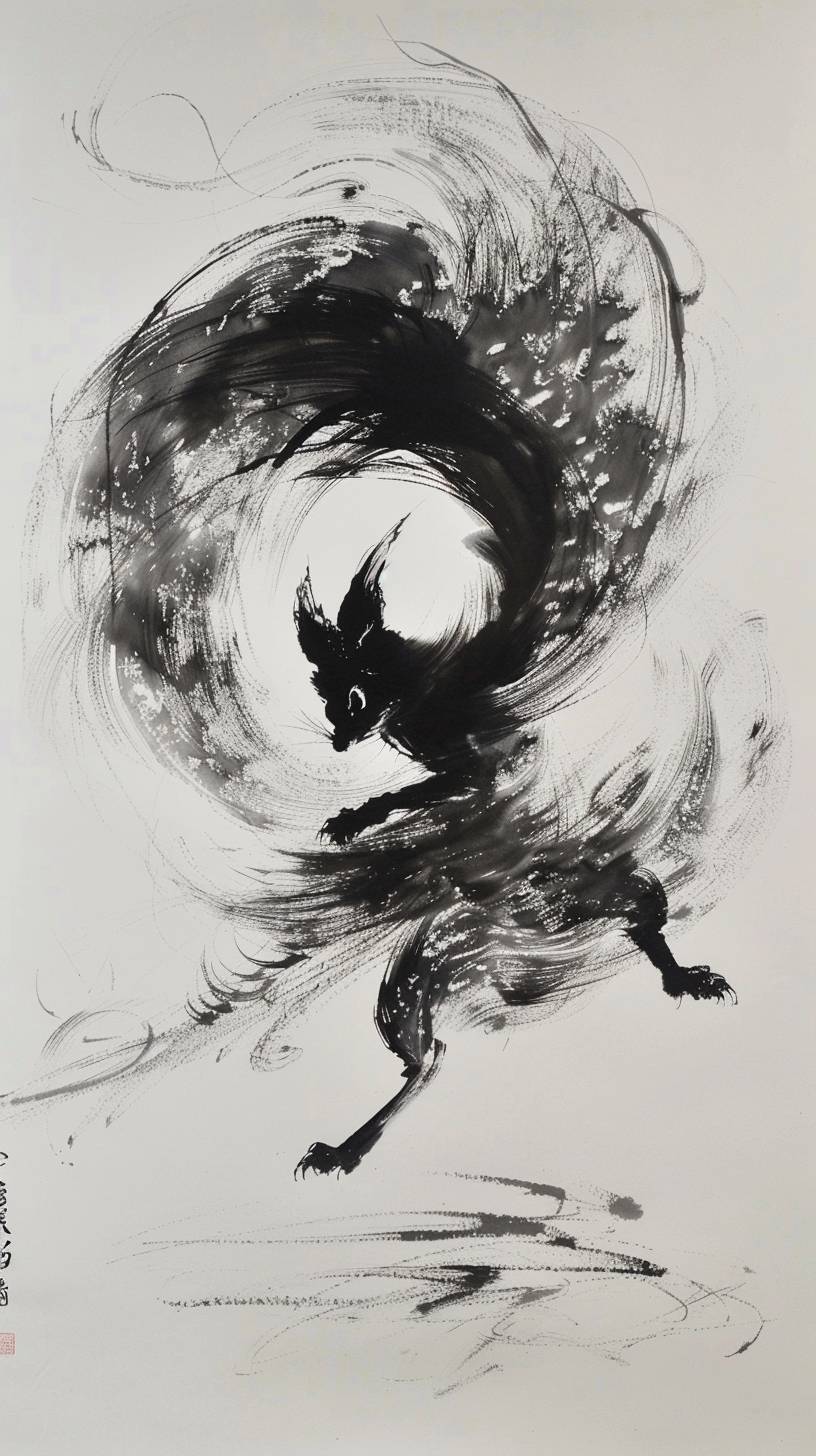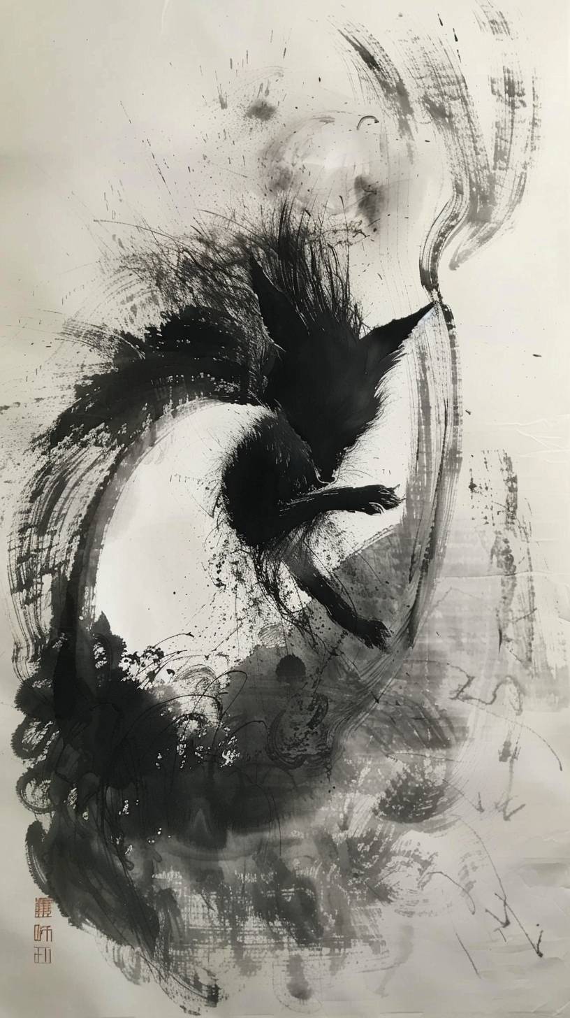 Sumi ink painting, a fox with nine tails dances bewitchingly, conveying a sense of fluidity and grace.
