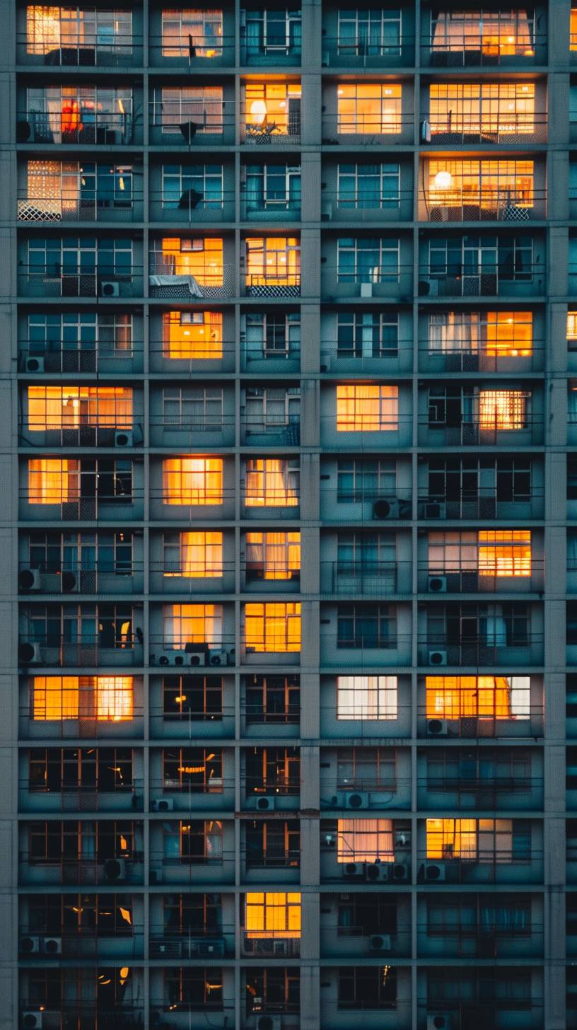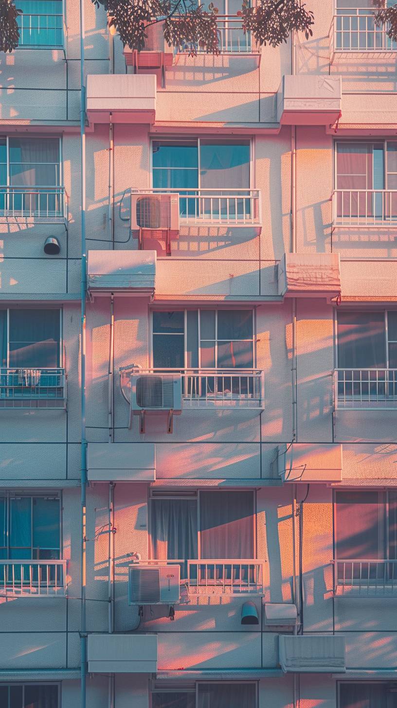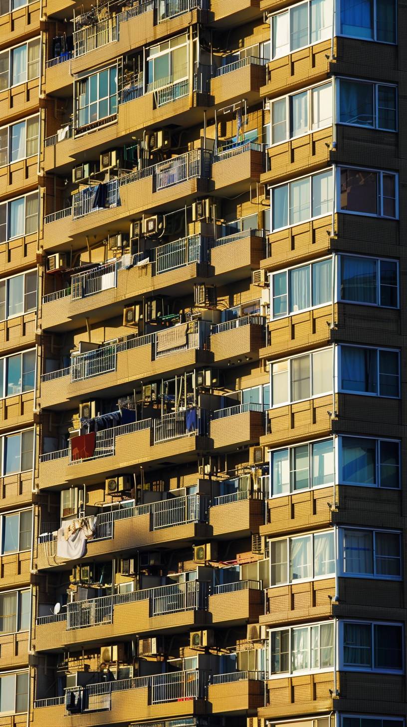 apartment building windows in tokyo during sun --ar 9:16 --v 6.0