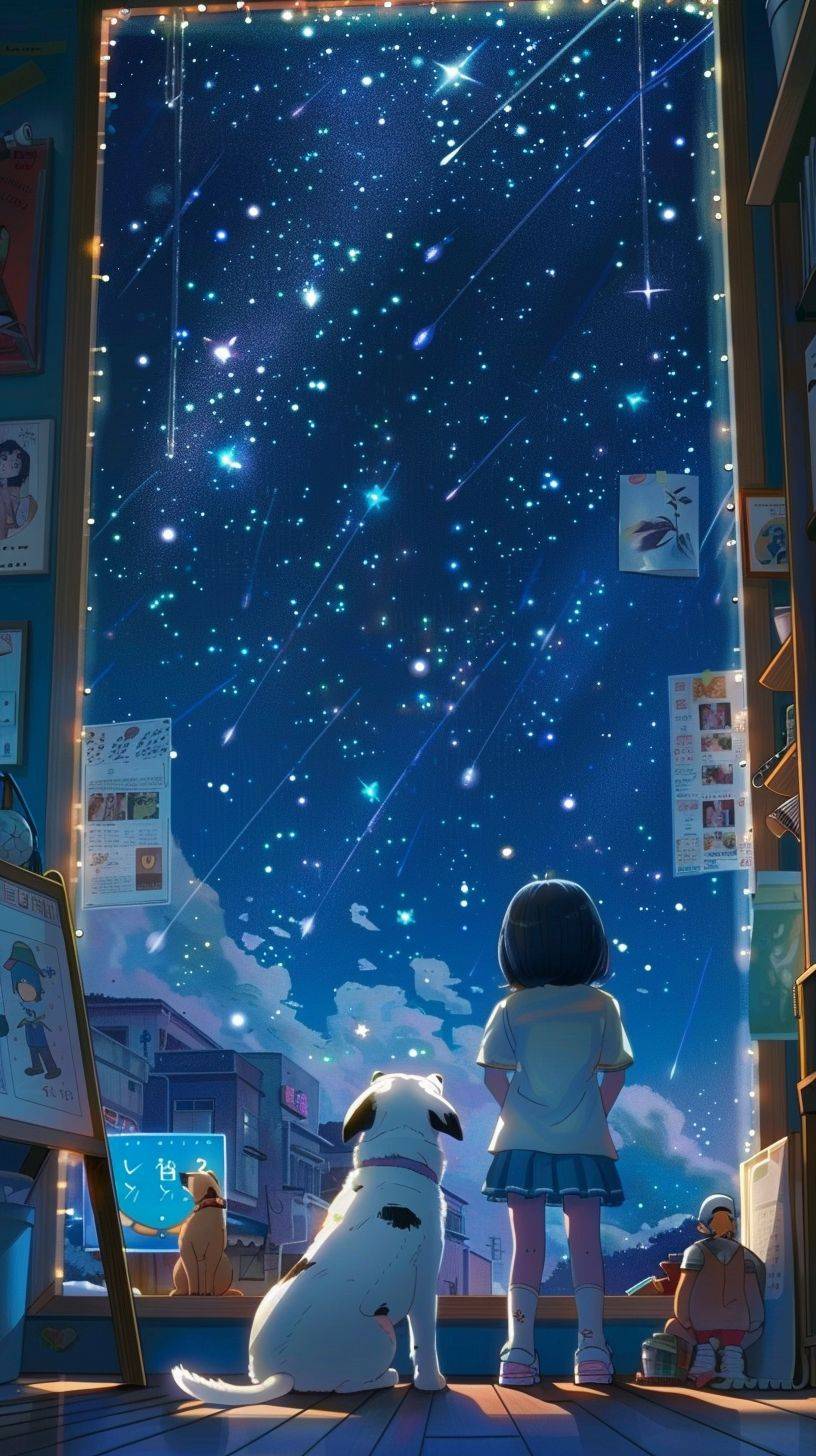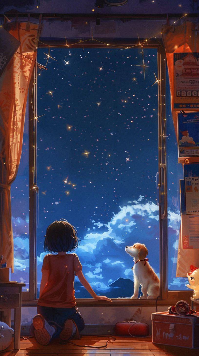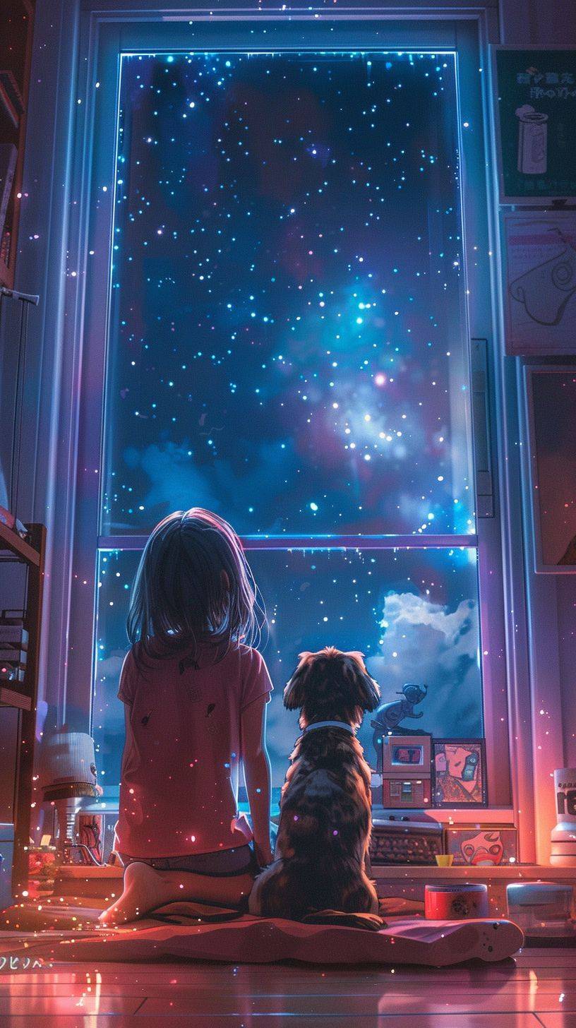 A cute japanese girl and her dog leaning against the window of a room, looking up at the starlit sky in Pixar style. The room features a photo of Ryuichi Sakamoto and a poster of Namsan, along with beautiful indirect lighting and pretty art toys --style raw --ar 9:16