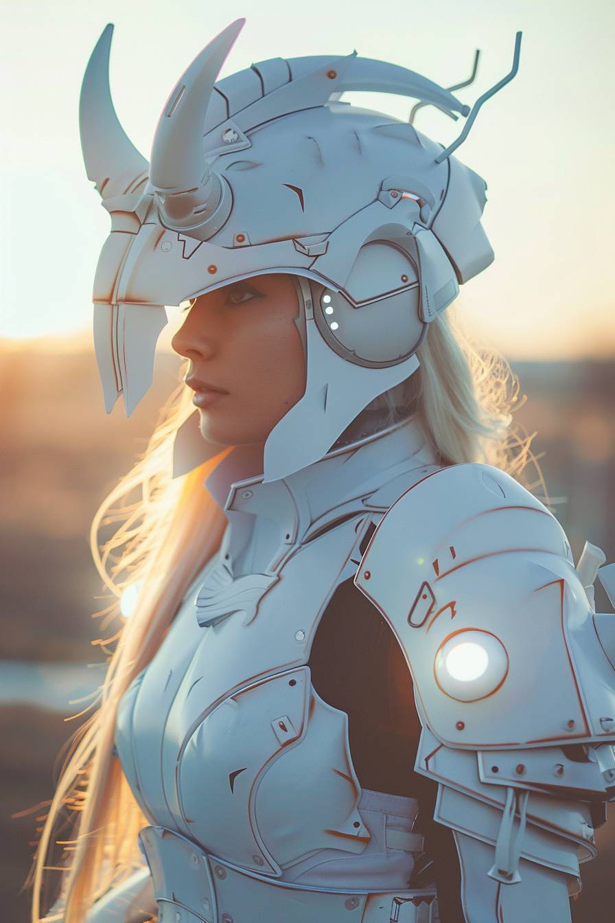 cinematic film still, beautiful woman wearing heavy armor, white sci-fi armor, white mecha armor, helmet with horns, backlight, film grain, dynamic pose, depth of field, close up