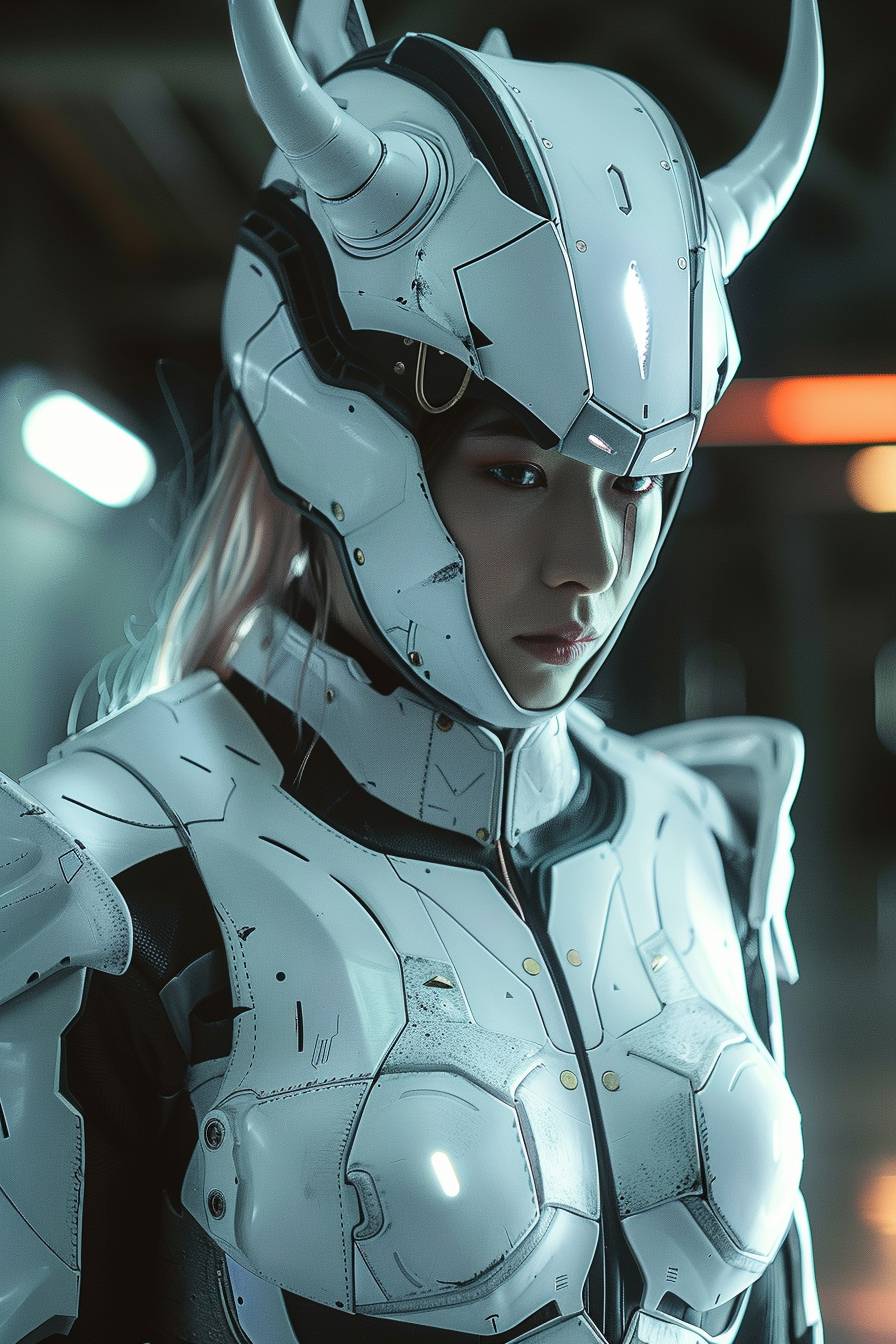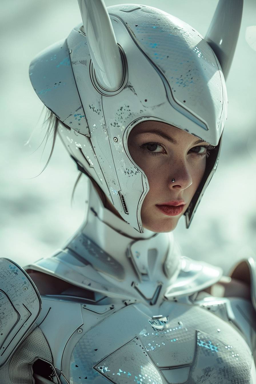 cinematic film still, beautiful woman Wearing a heavy armor, white sci-fi armor, white mecha armor, helmet with horns, backlight, film grain, dynamic pose, depth of field, Close up --ar 2:3 --v 6.0