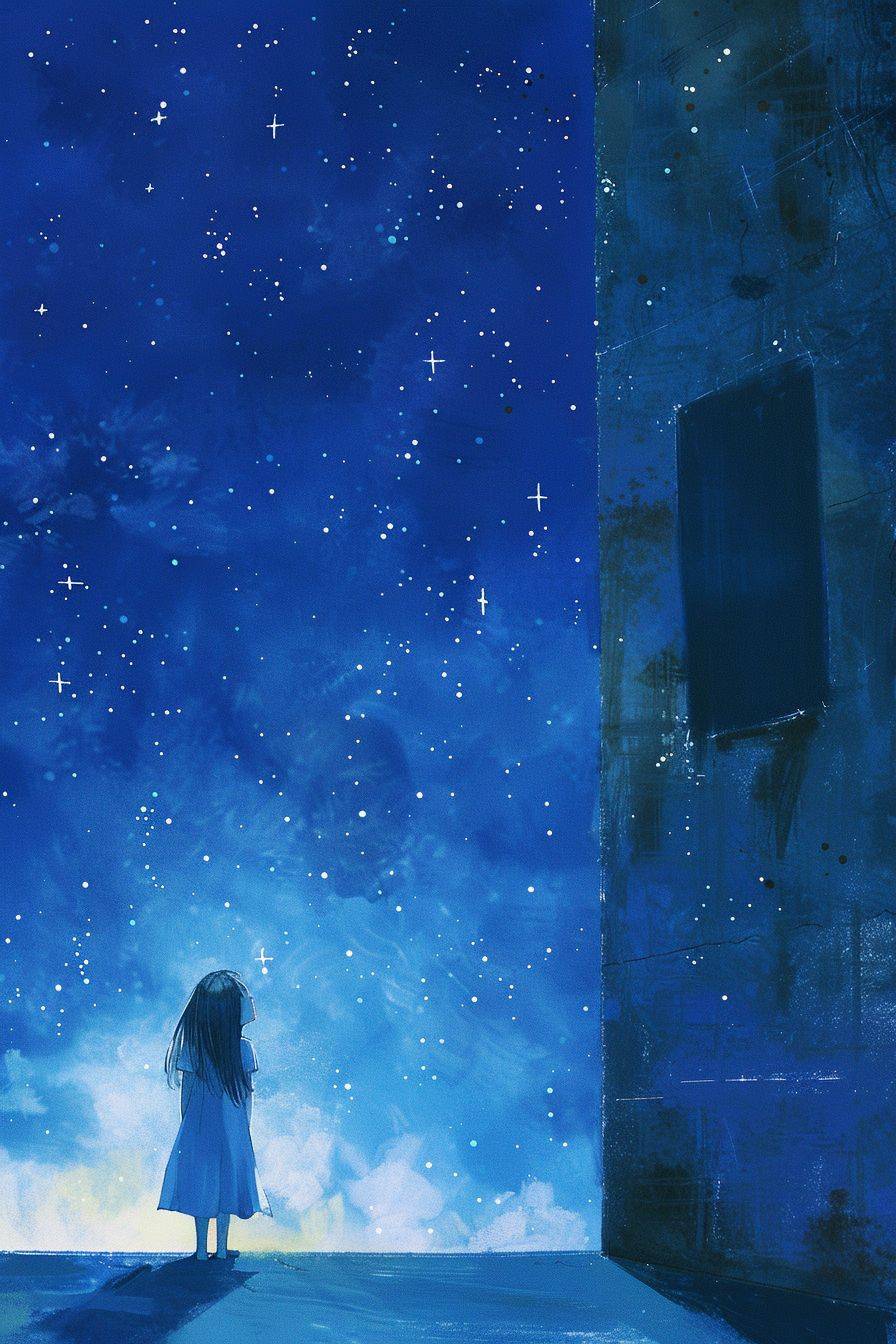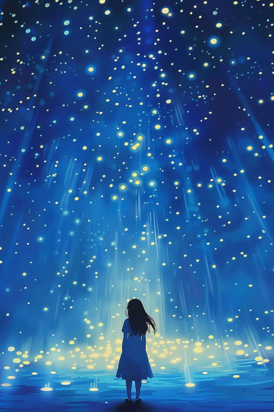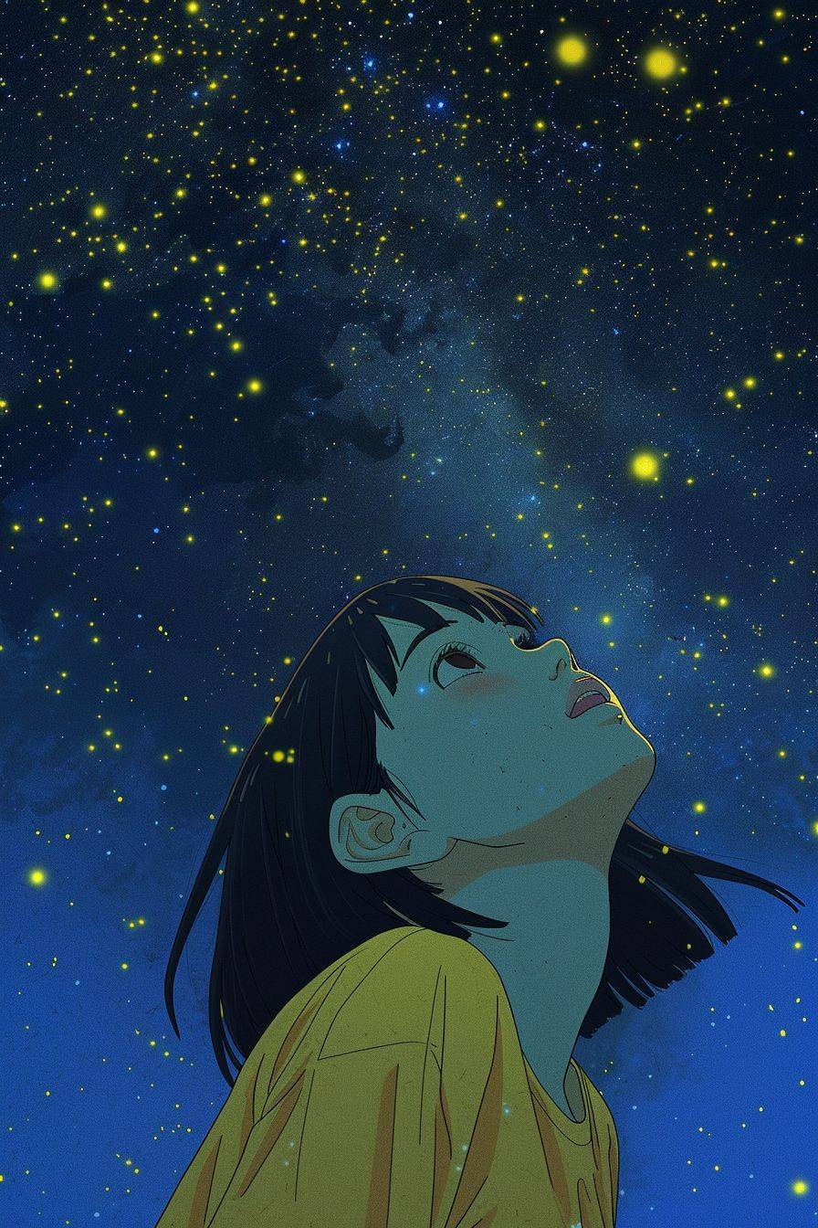 Miyazaki wallpapers, a girl looking up in the blue sky at night, stars, a light moving up | 2080x1080 | aarte wallpapers, in the style of miho hirano, wifredo lam, chilling creatures, light yellow and dark indigo, theodor kittelsen, digitally enhanced, cinestill 50d --ar 2:3