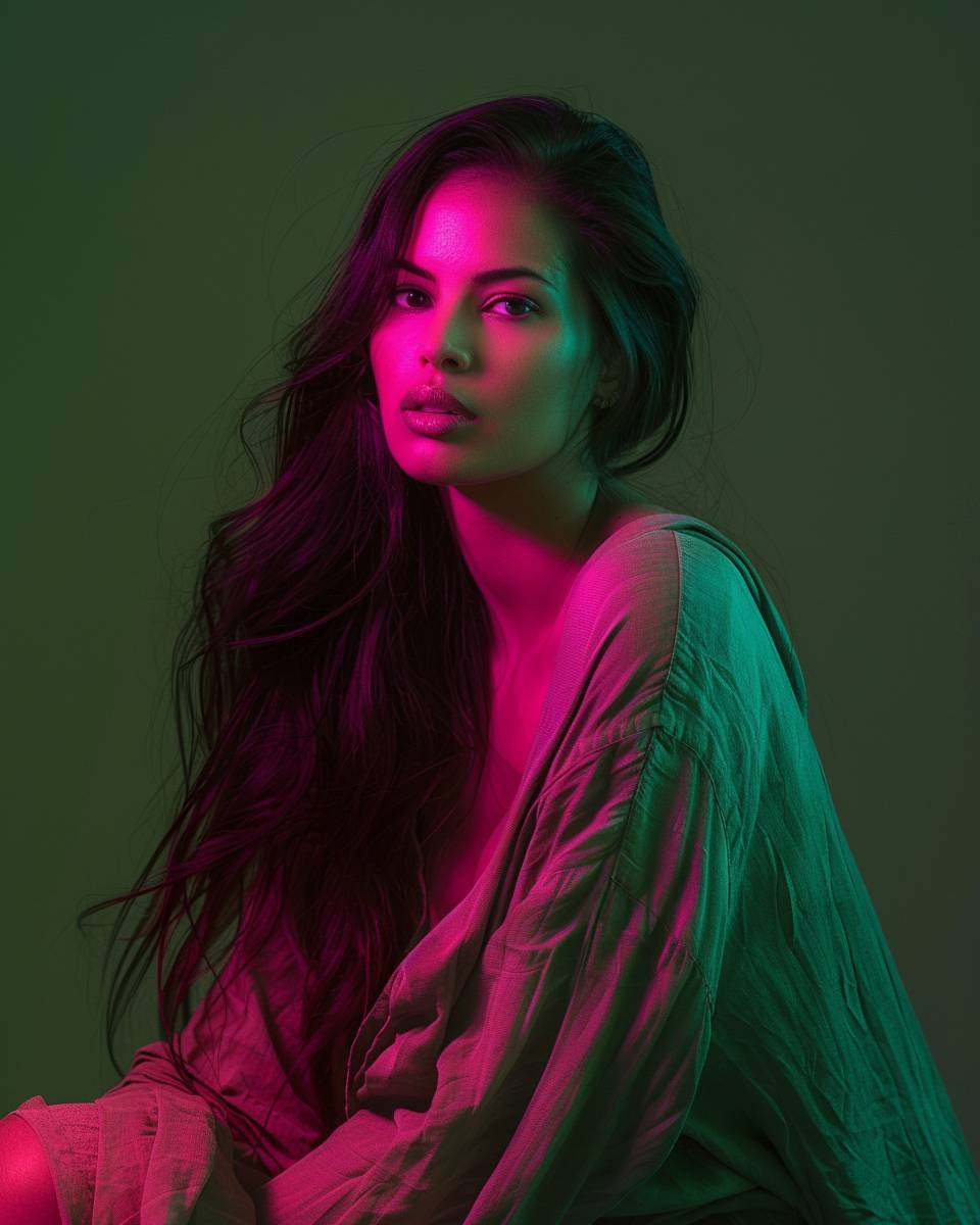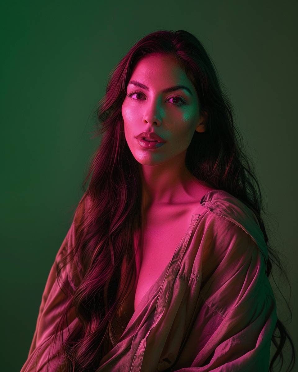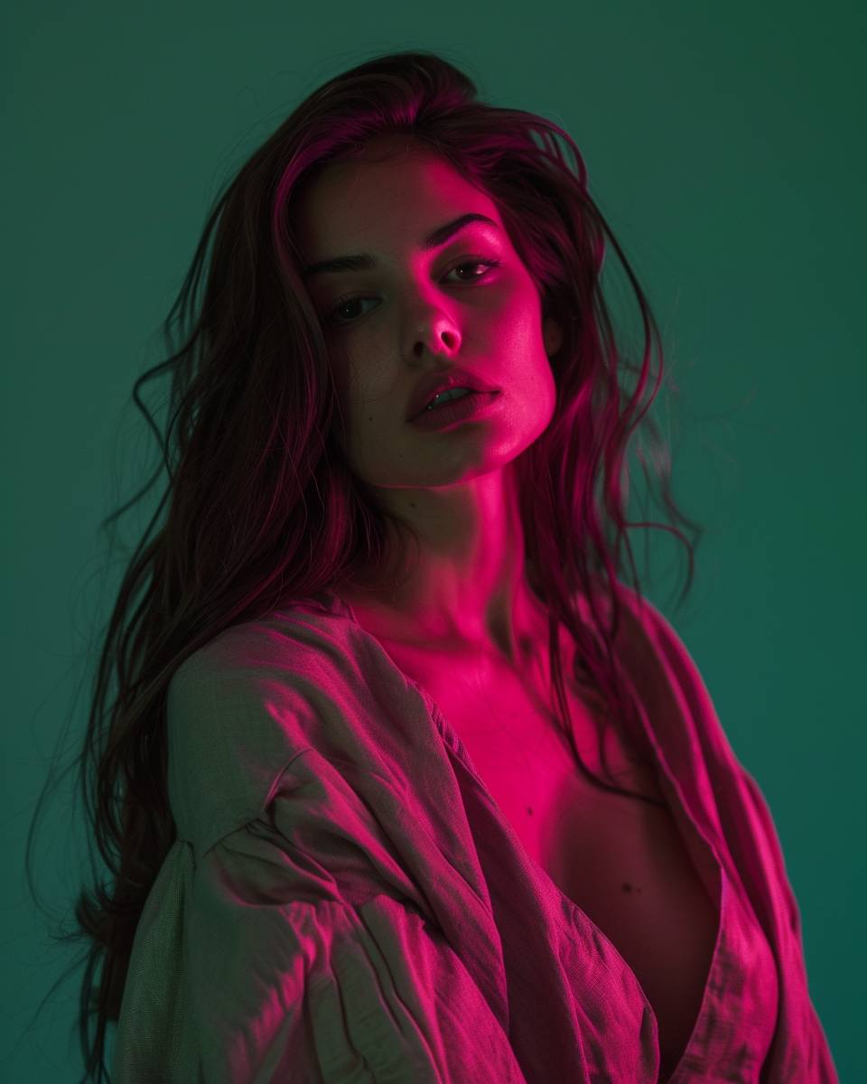 A beautiful brunette woman with curves and long hair, bathed in deep pink lighting, draped in a loose garment, against a strikingly contrasting green background, creating a striking visual effect. She has a serious expression, with a dramatic and atmospheric presence, strong contrast, enhanced visual intensity, and ambient occlusion.
