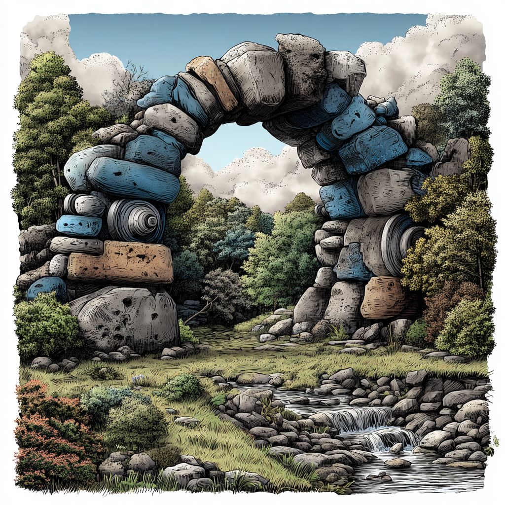A minimalist line art of a serene landscape with a tree under a moonlit sky.