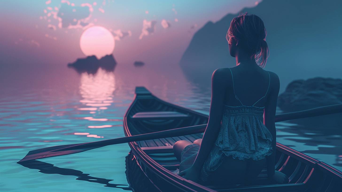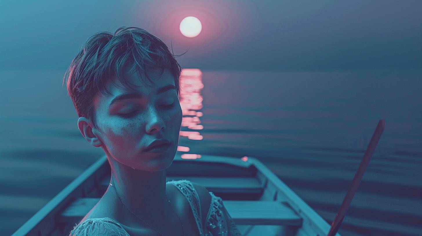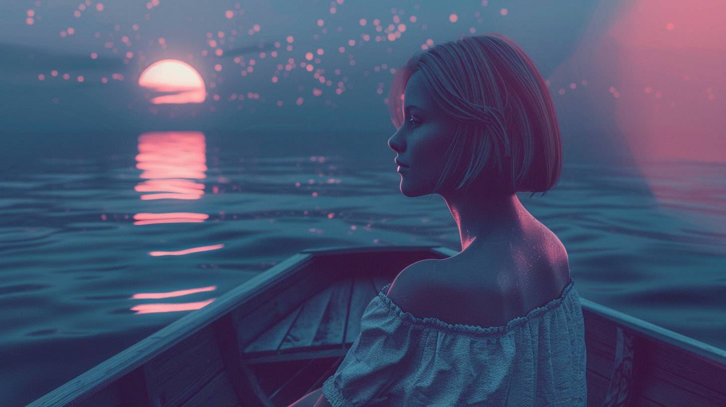 Close up of attractive woman with short hair with light of the setting sun on her skin and the vast ocean behind her capturing reflections of the sun. She sits on a rowboat with the light of the setting sun on her face. --sref 4158384349 --ar 16:9 --v 6.0