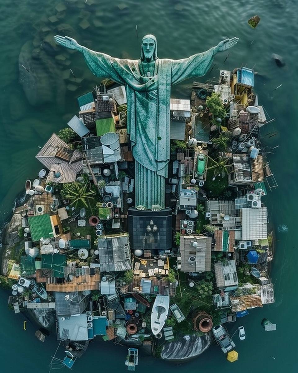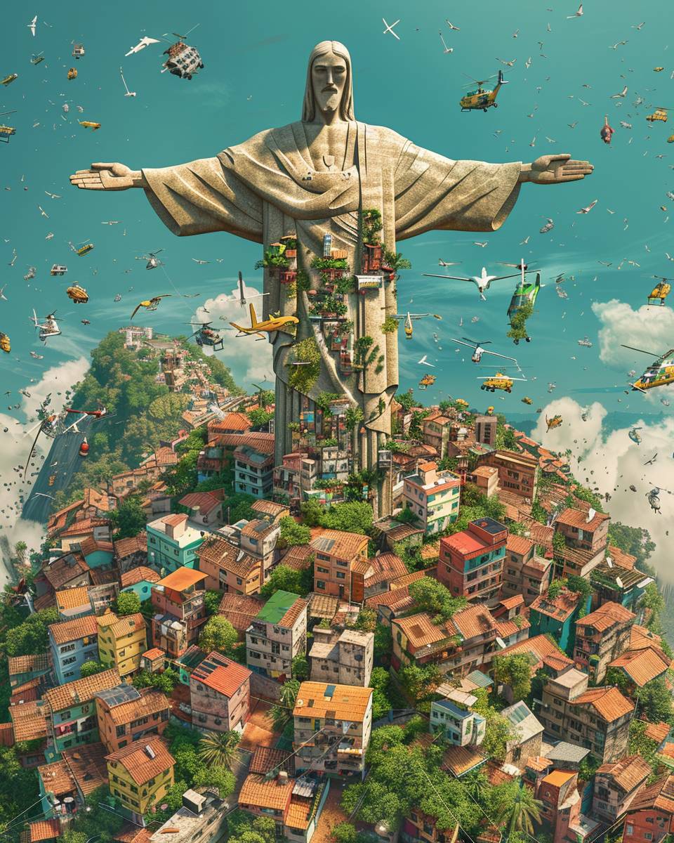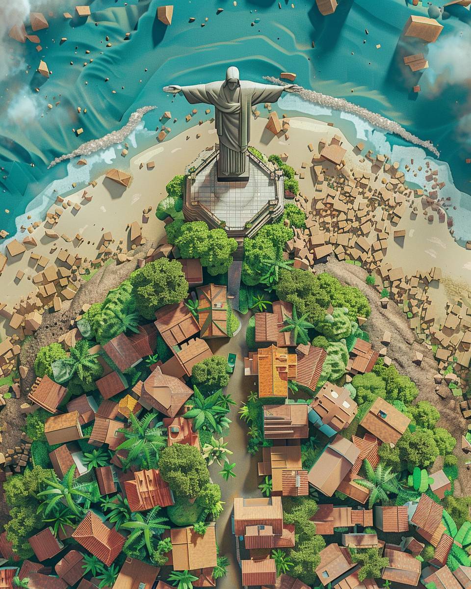 Christ the Redeemer statue in Rio de Janeiro, Brazil, houses in Brazil, Rio Beach, Maracana Stadium, found objects art, extreme detail, isolated, hyper realistic, seaside, 32k