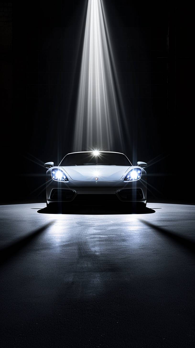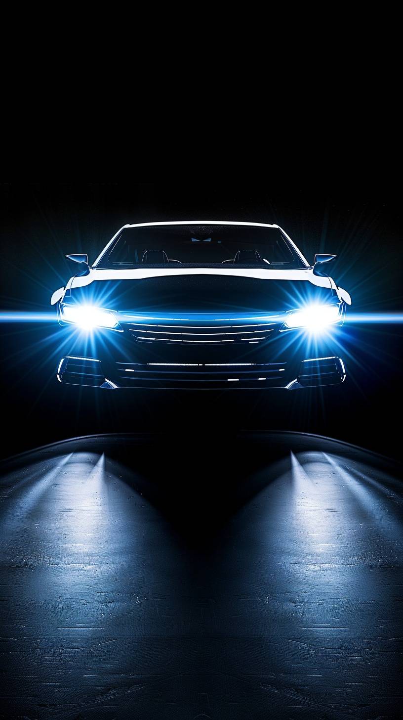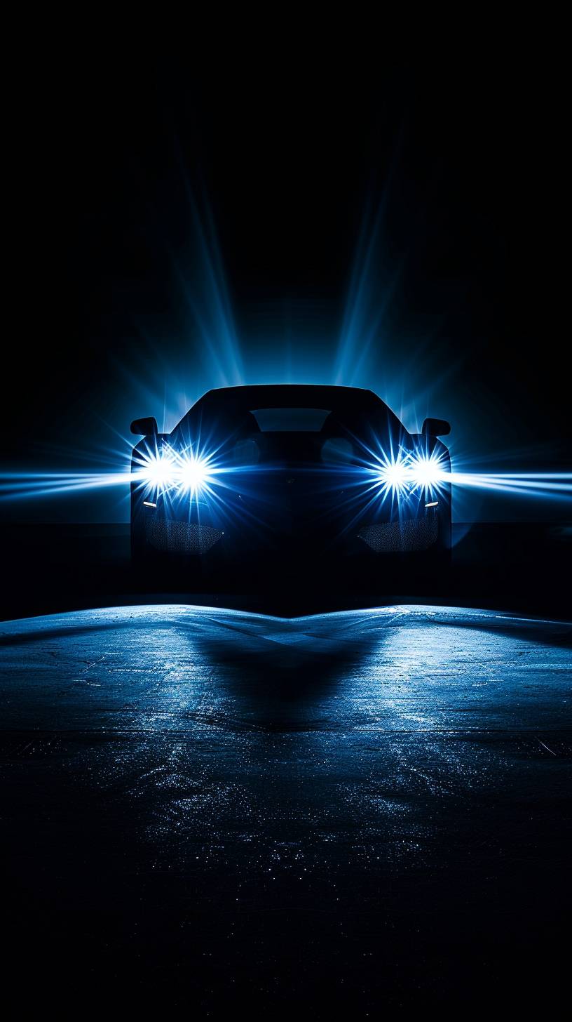 A car with strong front light beams shining directly toward the camera, set against a completely black background, creating a dramatic and intense illumination effect --ar 9:16 --v 6.0