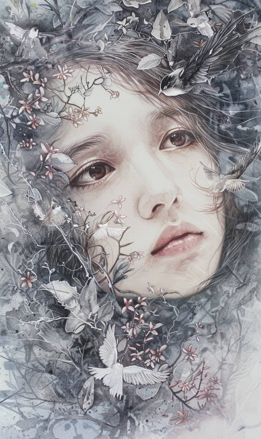 Watercolor painting of a delicate and beautiful lonely sylph.