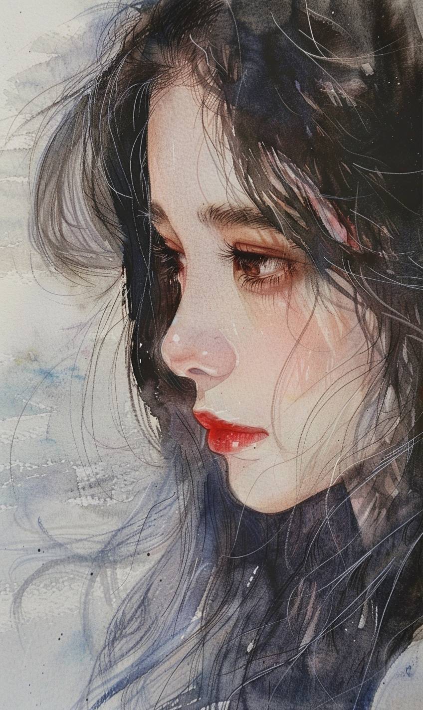 watercolor painting,an extremely delicate and beautiful, extremely fine, fine line illustration, a sylph,wind effects,melancholy look,pensive look,attentiveness,lonely, --ar 3:5 --v 6.0