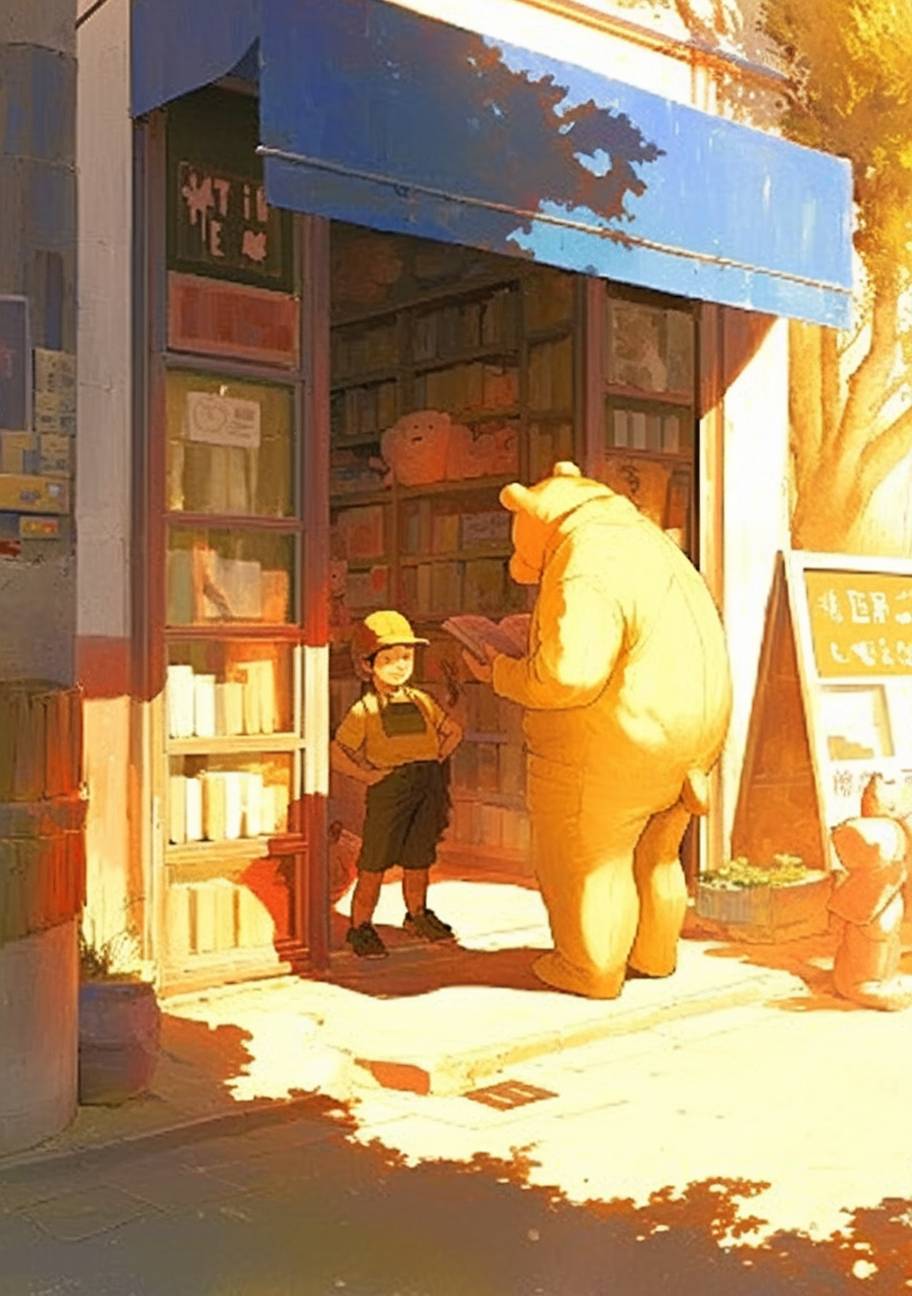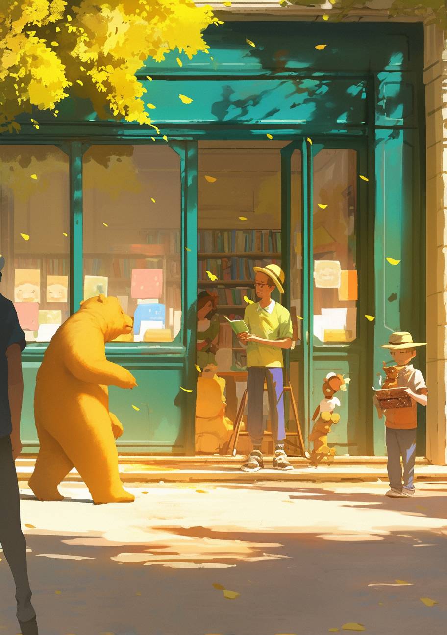 An adult man in a yellow hat stands at the front door of a public free basement, casually welcoming a little boy with a book in his hand, a curious child character plays with a teddy bear, all cartoon characters are having fun. This scene takes place outside the bookstore, with a white wall in the background. A feeling of joy. Sunlight shines through the windows at sunrise --ar 7:10 --niji 6
