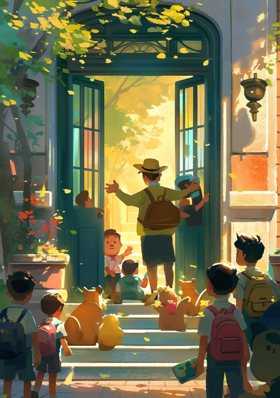 An adult man in a yellow hat stands at the front door of a public free basement, casually welcoming a little boy with a book in his hand. A curious child character plays with a teddy bear, and all cartoon characters are having fun. This scene takes place outside the bookstore, with a white wall in the background. A feeling of joy. Sunlight shines through the windows at sunrise.